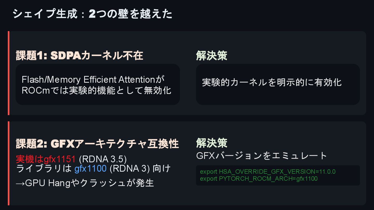 4. シェイプ生成:2つの壁を越えた 課題1: SDPAカーネル不在 Flash/Memory Efficient Attentionが ROCmでは実験的機能として無効化 解決策 実験的カーネルを明示的に有効化 課題2: