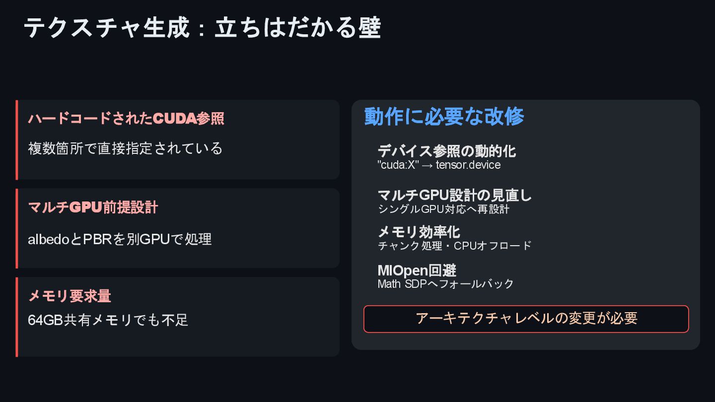 → tensor.device マルチGPU設計の見直し シングルGPU対応へ再設計 メモリ効率化 チャンク処理・CPUオフロード MIOpen回避 Math SDPへフォールバック アーキテクチャレベルの変更が必要
