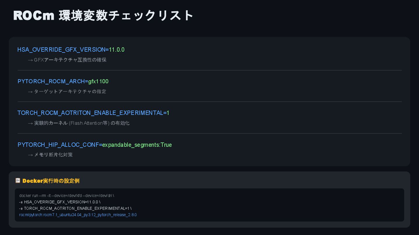 6. ROCm 環境変数チェックリスト HSA_OVERRIDE_GFX_VERSION=11.0.0 → GFXアーキテクチャ互換性の確保 PYTORCH_ROCM_ARCH=gfx1100 → ターゲットアーキテクチャの指定 TORCH_ROCM_AOTRITON_ENABLE_EXPERIMENTAL=1 →