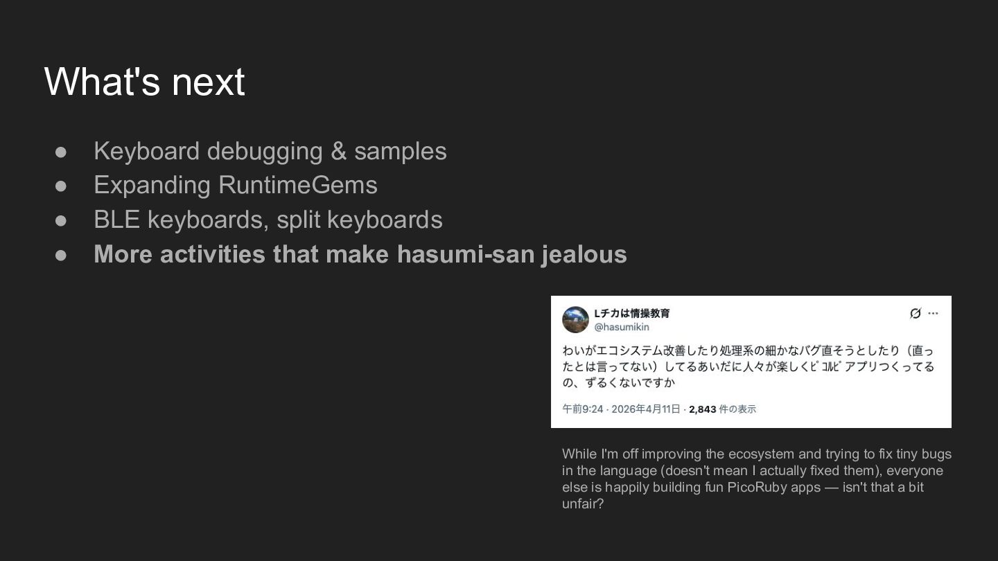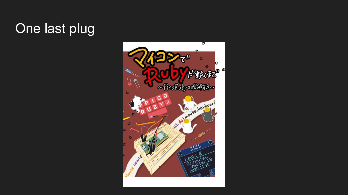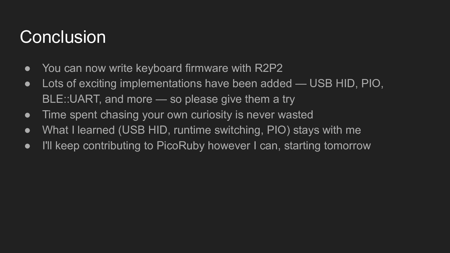 • Lots of exciting implementations have been added — USB HID, PIO, BLE::UART, and more — so please give them a try • Time spent chasing your own curiosity is never wasted • What I learned (USB HID, runtime switching, PIO) stays with me • I'll keep contributing to PicoRuby however I can, starting tomorrow