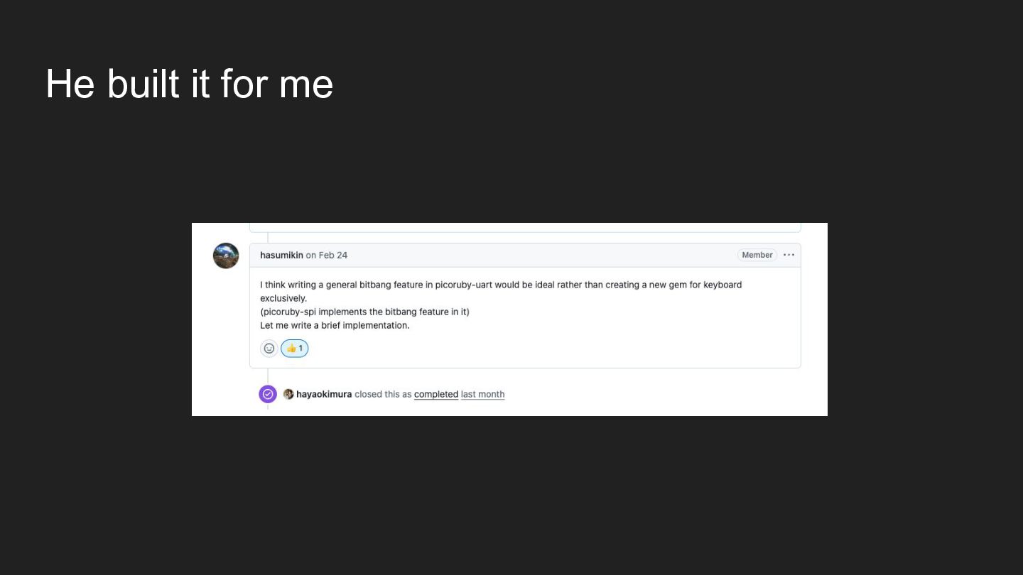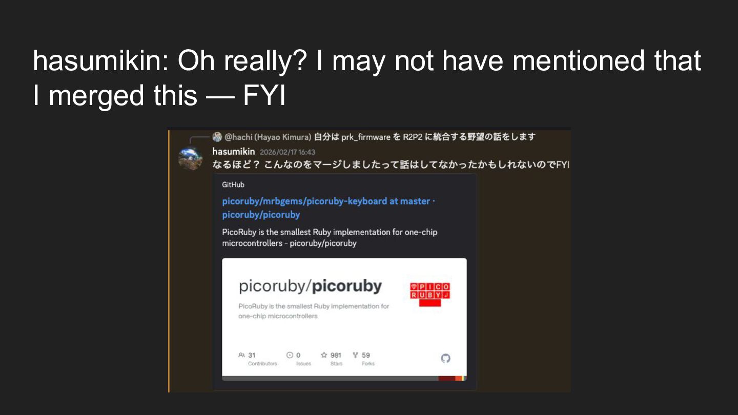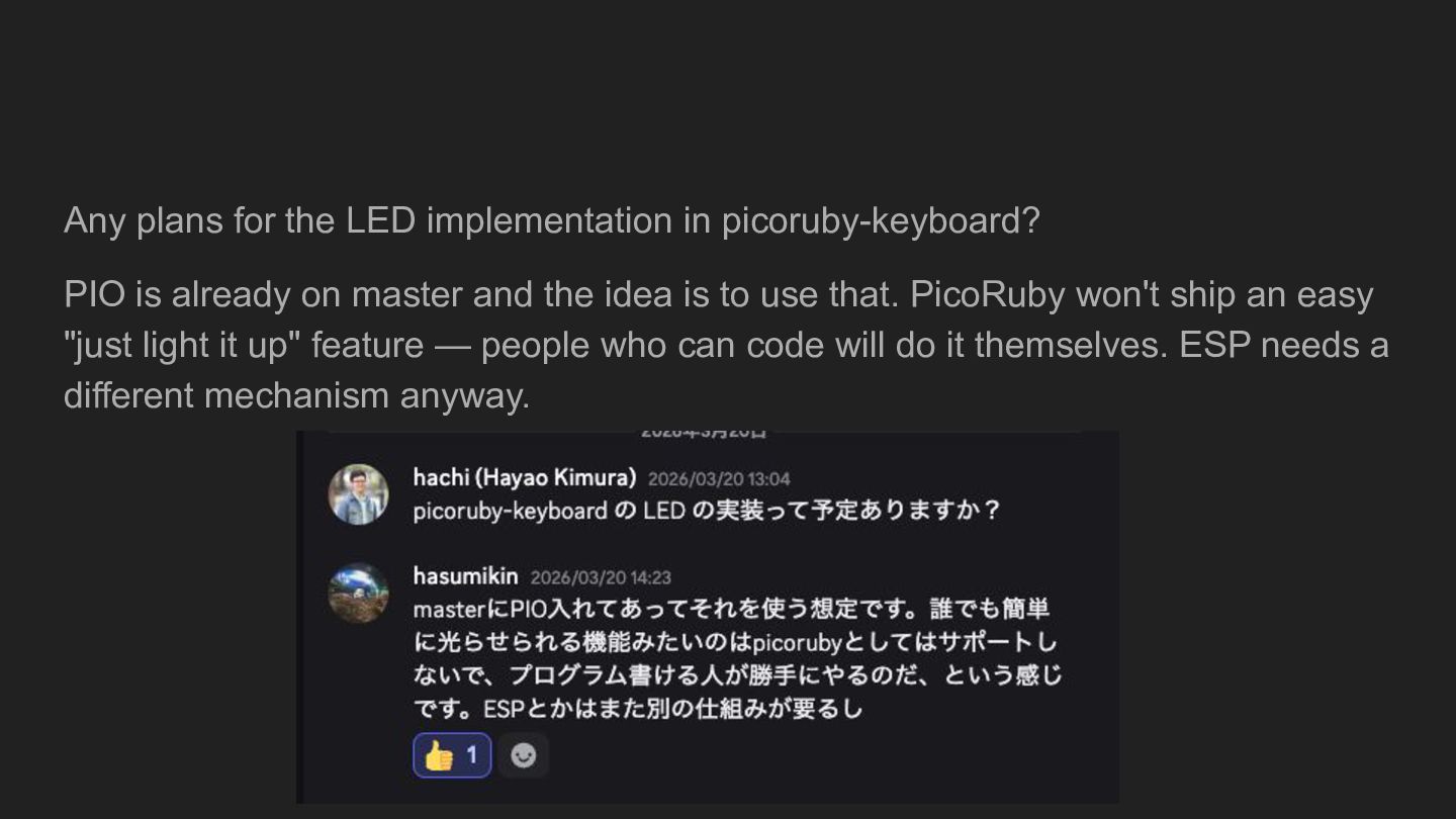 • Lots of exciting implementations have been added — USB HID, PIO, BLE::UART, and more — so please give them a try • Time spent chasing your own curiosity is never wasted • What I learned (USB HID, runtime switching, PIO) stays with me • I'll keep contributing to PicoRuby however I can, starting tomorrow