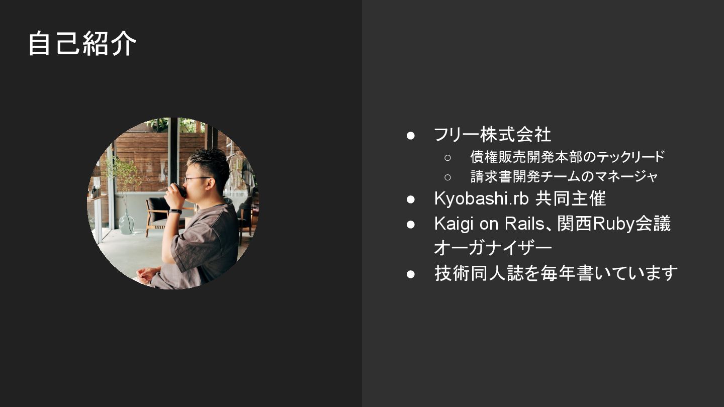 • フリー株式会社 ◦ 債権販売開発本部のテックリード ◦ 請求書開発チームのマネージャ • Kyobashi.rb 共同主催 •