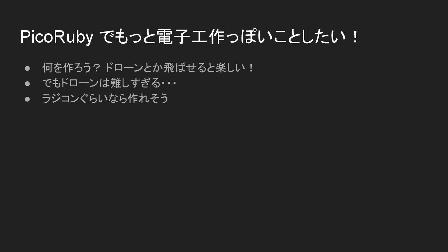 PicoRuby でもっと電子工作っぽいことしたい! • 何を作ろう? ドローンとか飛ばせると楽しい! • でもドローンは難しすぎる・・・ • ラジコンぐらいなら作れそう