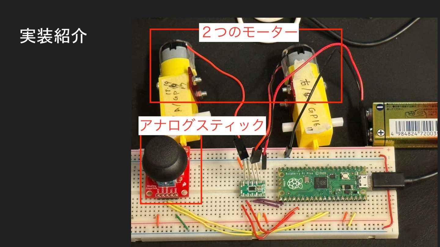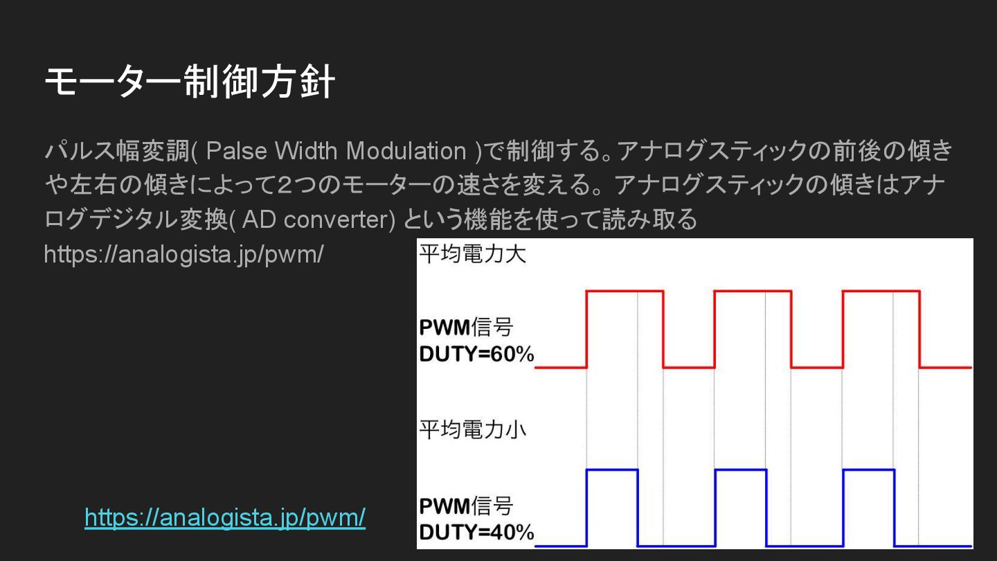 モーター制御方針 パルス幅変調( Palse Width Modulation )で制御する。アナログスティックの前後の傾き や左右の傾きによって2つのモーターの速さを変える。 アナログスティックの傾きはアナ ログデジタル変換( AD