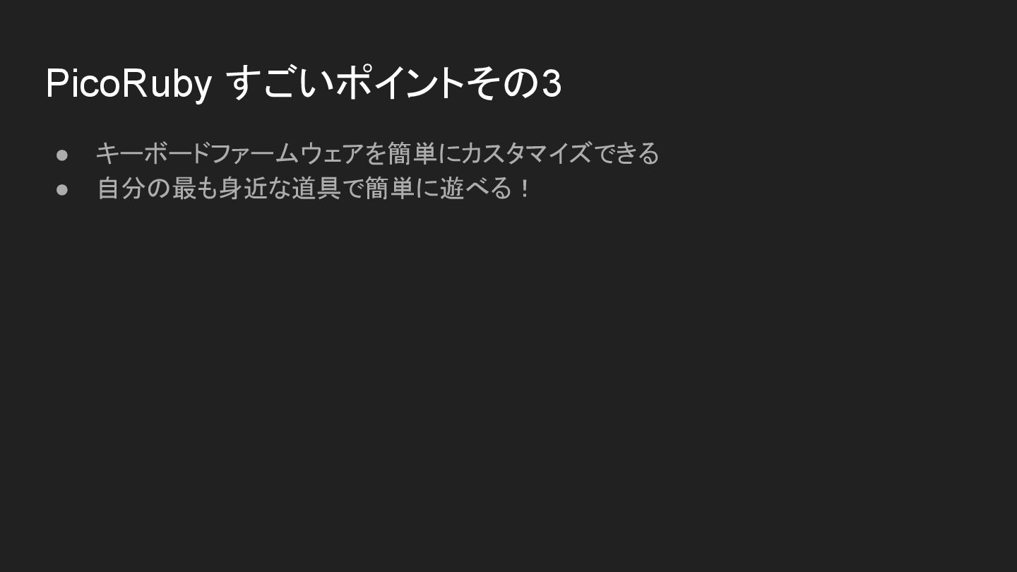 PicoRuby すごいポイントその3 • キーボードファームウェアを簡単にカスタマイズできる • 自分の最も身近な道具で簡単に遊べる!