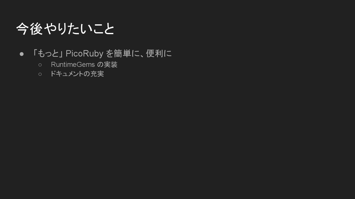 今後やりたいこと • 「もっと」 PicoRuby を簡単に、便利に ◦ RuntimeGems の実装 ◦ ドキュメントの充実