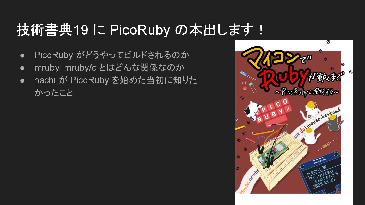技術書典19 に PicoRuby の本出します! • PicoRuby がどうやってビルドされるのか • mruby, mruby/c