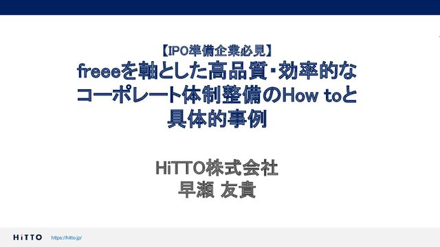 https://hitto.jp/ HiTTO株式会社 早瀬 友貴 【IPO準備企業必見】 freeeを軸とした高品質・効率的な コーポレート体制整備のHow toと 具体的事例