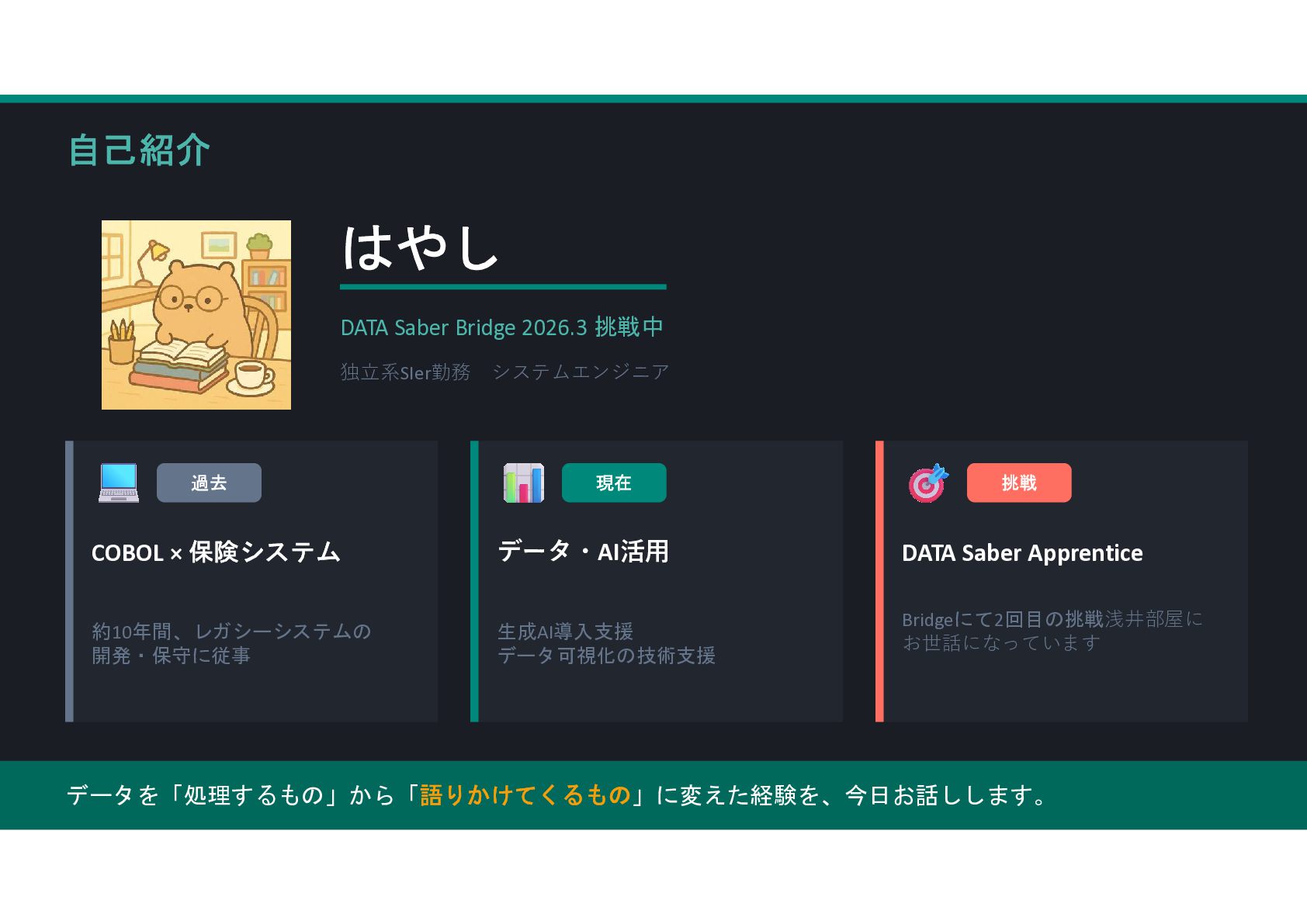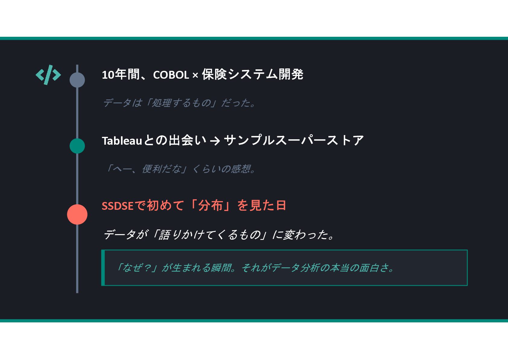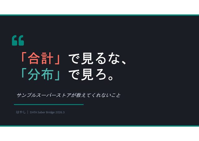 This talk explores what happens when you move beyond bar charts and start looking at distributions. Using free government statistics (SSDSE) on household meat expenditure across 47 Japanese prefectural capitals, a simple strip plot reveals that beef spending varies by over 3x between cities — a pattern completely invisible in a bar chart of averages. Digging into "why" uncovers centuries of agricultural history and regional food culture.