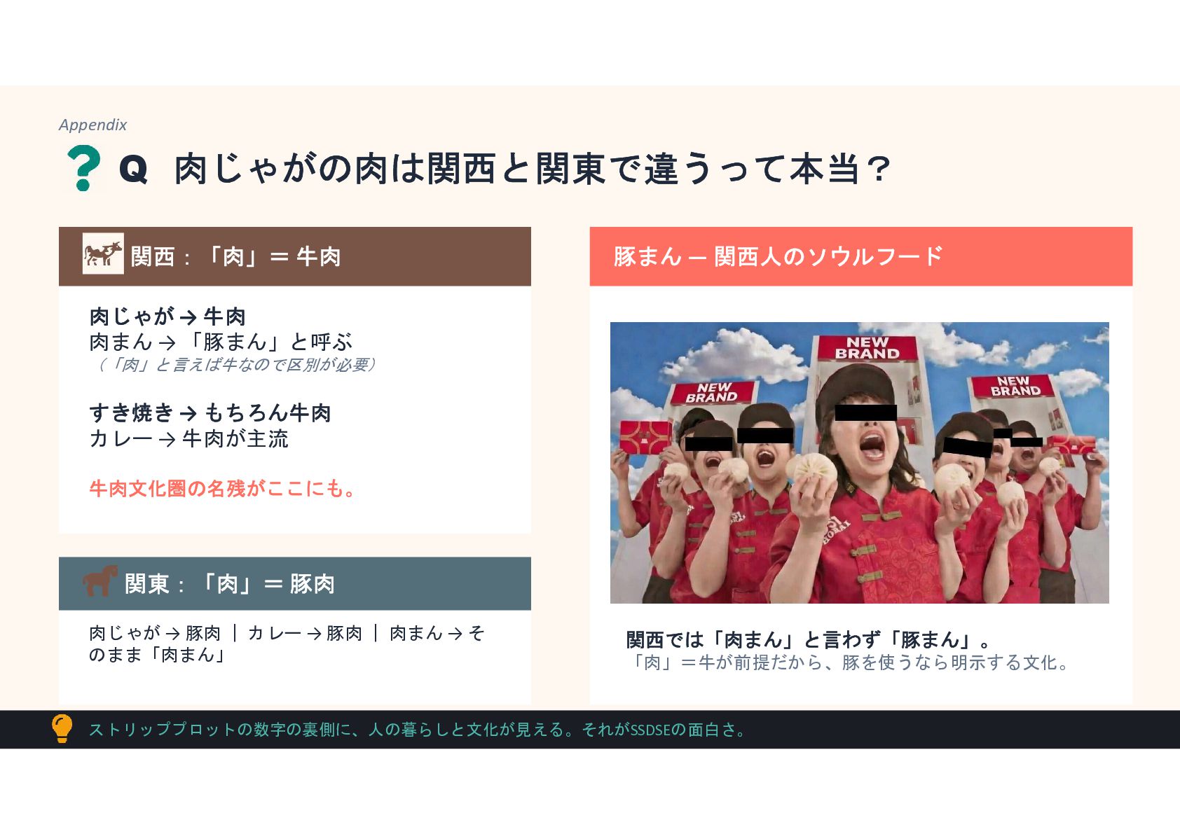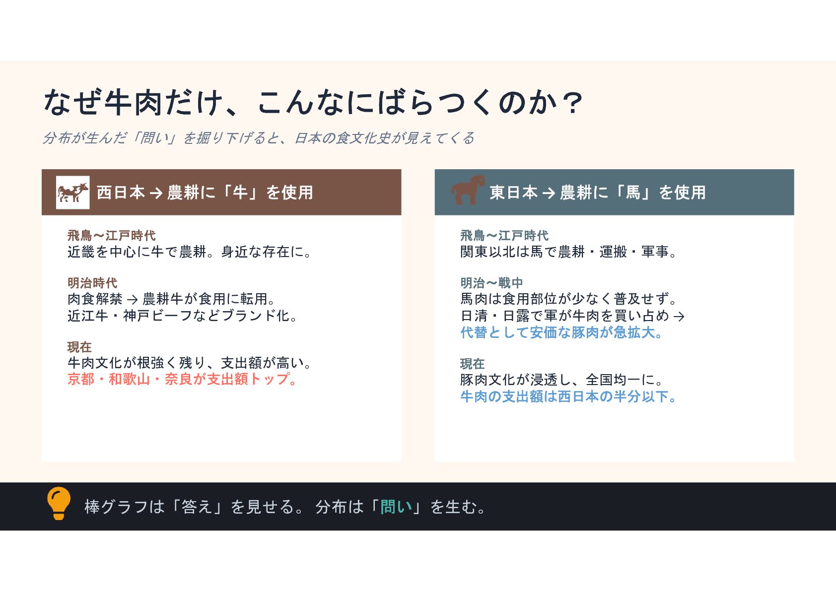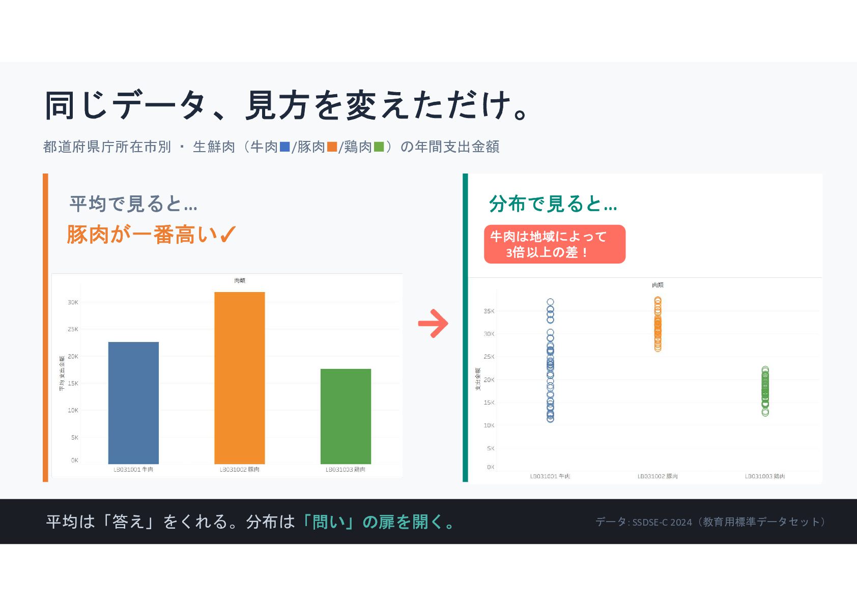 題材は、政府系組織が無料公開しているSSDSE(教育用標準データセット)の生鮮肉の支出金額データ。同じデータでも見方を変えるだけで、牛肉の3倍の地域差や、その背景にある日本の農耕史・食文化の違いまで見えてきます。