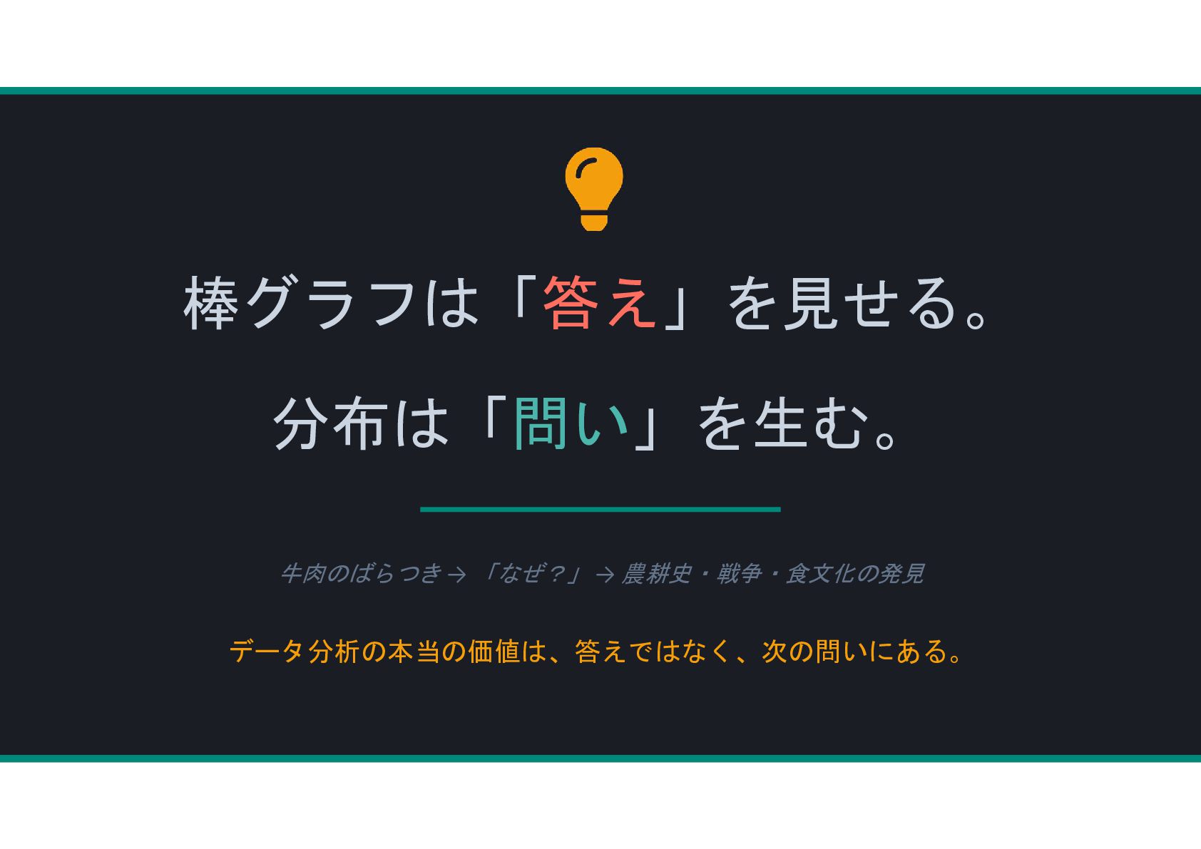棒グラフで平均を比較するだけでは見えない、「分布」から生まれる問いの力について話しています。