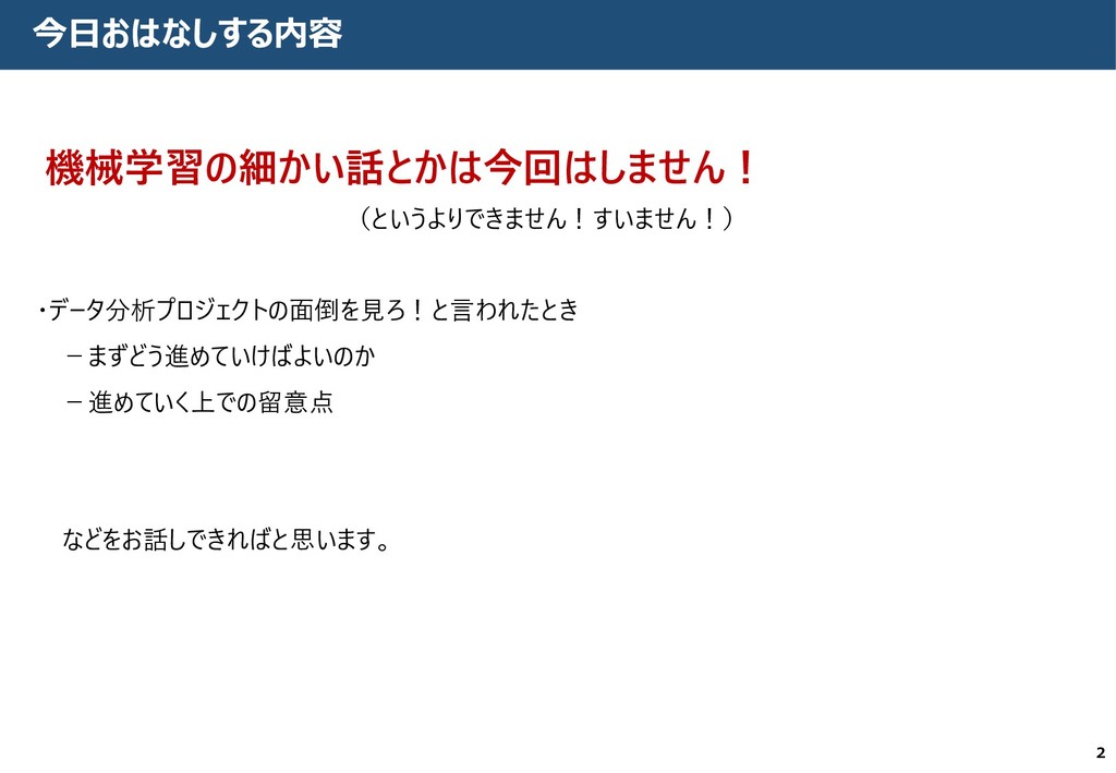 今日おはなしする内容 機械学習の細かい話とかは今回はしません! (というよりできません!すいません!) ・データ分析プロジェクトの面倒を見ろ!と言われたとき -まずどう進めていけばよいのか -進めていく上での留意点 などをお話しできればと思います。 2