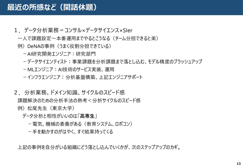 課題解決のための分析手法の熟考<分析サイクルのスピード感 例)松尾先生(東京大学) データ分析と相性がいいのは「高専生」 -電気、機械の素養がある(教育システム、ロボコン) -手を動かすのがはやく、すぐ結果持ってくる 上記の事例を自分がいる組織にどう落とし込んでいくかが、次のステップアップのカギ。