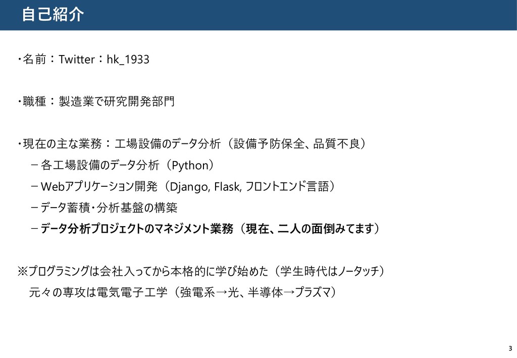 自己紹介 ・名前:Twitter:hk_1933 ・職種:製造業で研究開発部門 ・現在の主な業務:工場設備のデータ分析(設備予防保全、品質不良) -各工場設備のデータ分析(Python) -Webアプリケーション開発(Django, Flask, フロントエンド言語) -データ蓄積・分析基盤の構築 -データ分析プロジェクトのマネジメント業務(現在、二人の面倒みてます)