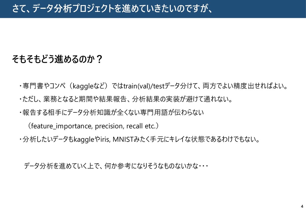 さて、データ分析プロジェクトを進めていきたいのですが、 そもそもどう進めるのか? ・専門書やコンペ(kaggleなど)ではtrain(val)/testデータ分けて、両方でよい精度出せればよい。 ・ただし、業務となると期間や結果報告、分析結果の実装が避けて通れない。 ・報告する相手にデータ分析知識が全くない専門用語が伝わらない (feature_importance, precision, recall etc.) ・分析したいデータもkaggleやiris,