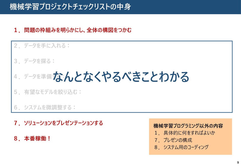 なんとなくやるべきことわかる 機械学習プログラミング以外の内容 1.具体的に何をすればよいか 7.プレゼンの構成 8.システム用のコーディング