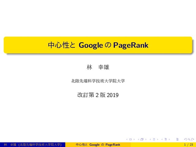 t , w ∼ w′ t δs,•(v) = {w|v∈Ps (w)} σsv σsw (1 + δs,•(w)), Ps (w) def = {v ∈ V |(v, w) ∈ E, d(s, w) = d(s, v) + 1}, w ∈ ∂v s v w w’ Ps(w) t t’ : : : : σ sw σ sv : U.Brandes, Journal of Math. Sociology 25, 2001 ( ) Google PageRank 8 / 23