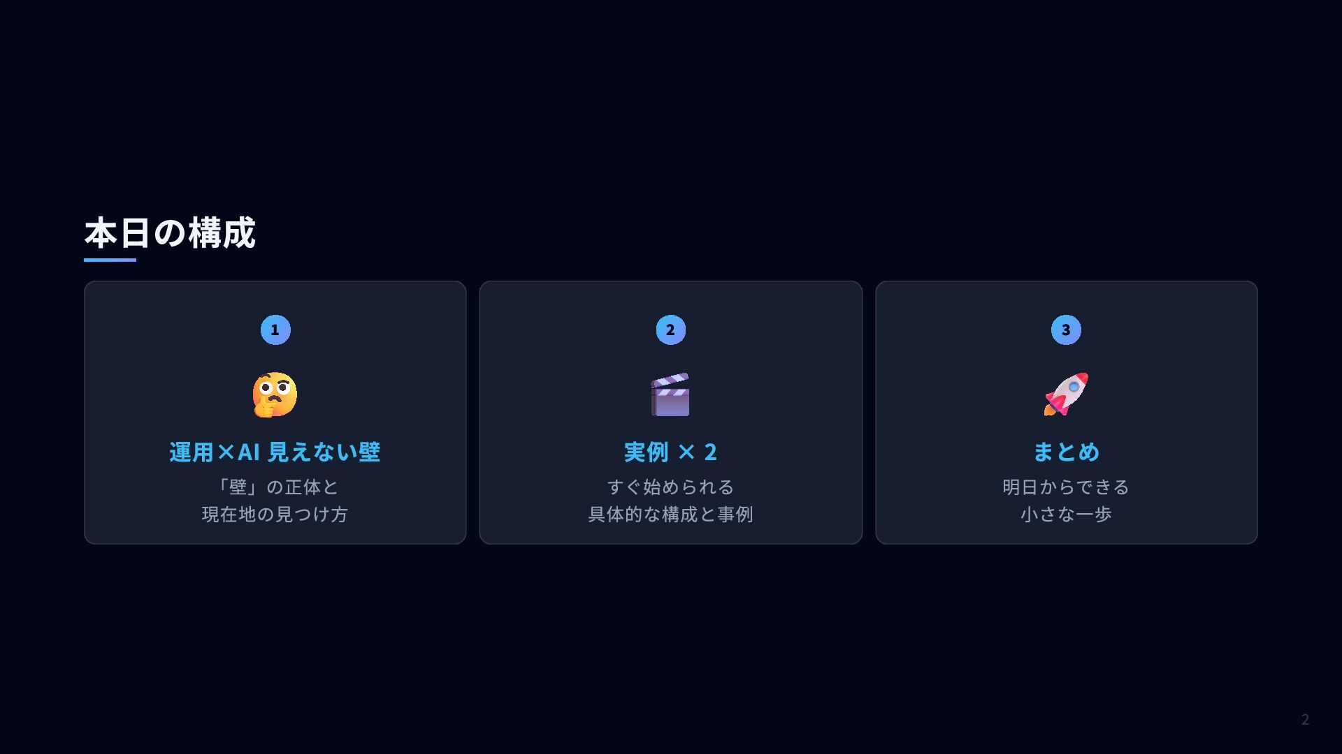 1 🤔 運用×AI 見えない壁 「壁」の正体と 現在地の見つけ方 2 🎬 実例 ×