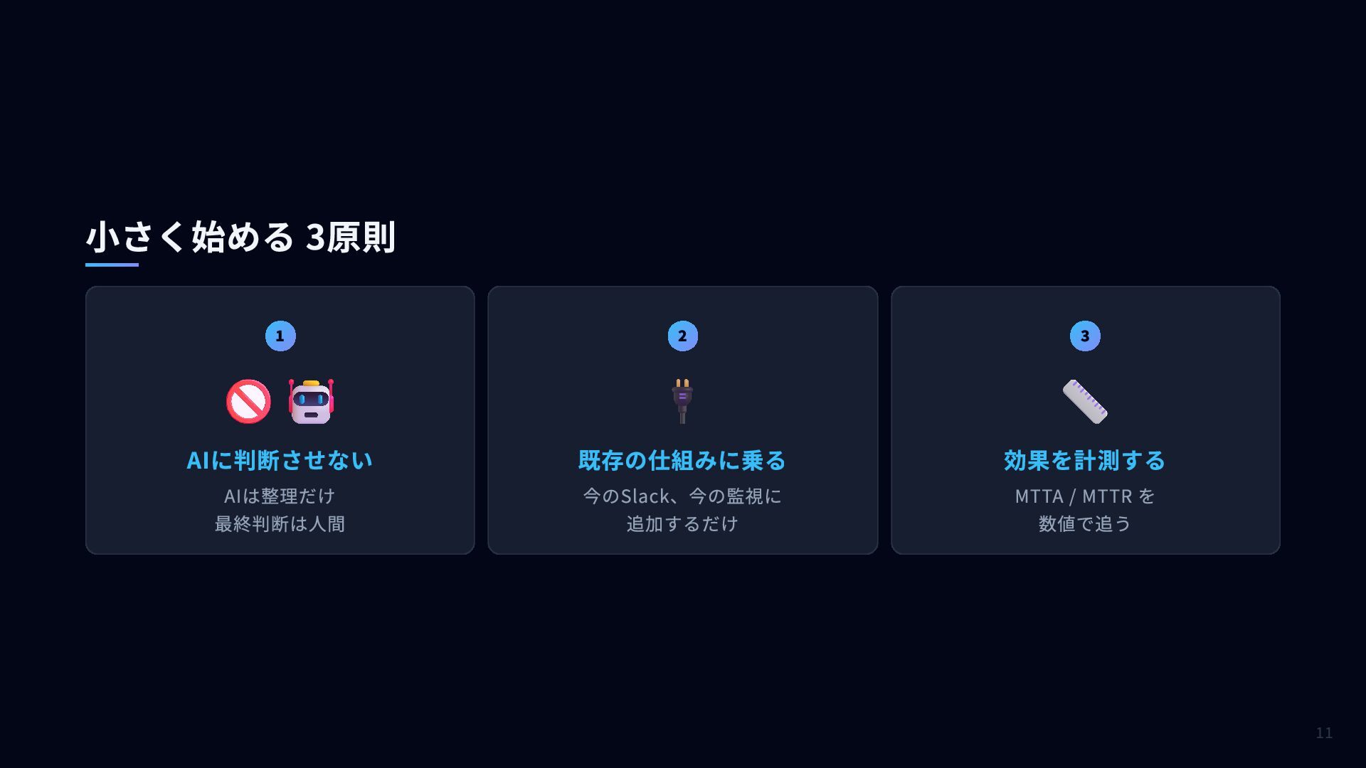 1 🚫🤖 AIに判断させない AIは整理だけ 最終判断は人間 2 🔌 既存の仕組みに乗る 今のSlack、今の監視に 追加するだけ