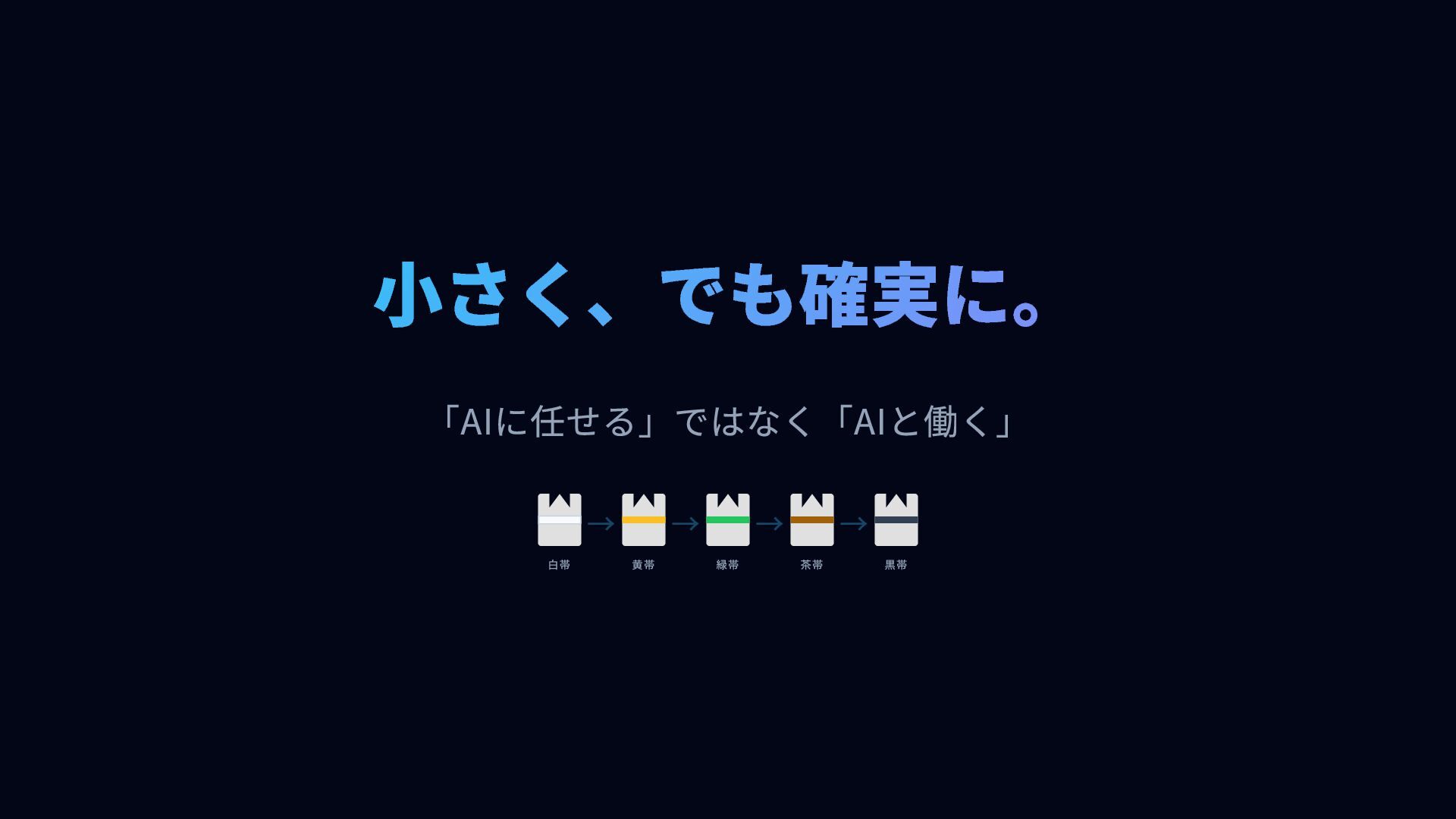 小さく、でも確実に。 「AIに任せる」ではなく「AIと働く」 白帯 → 黄帯 → 緑帯 → 茶帯 →