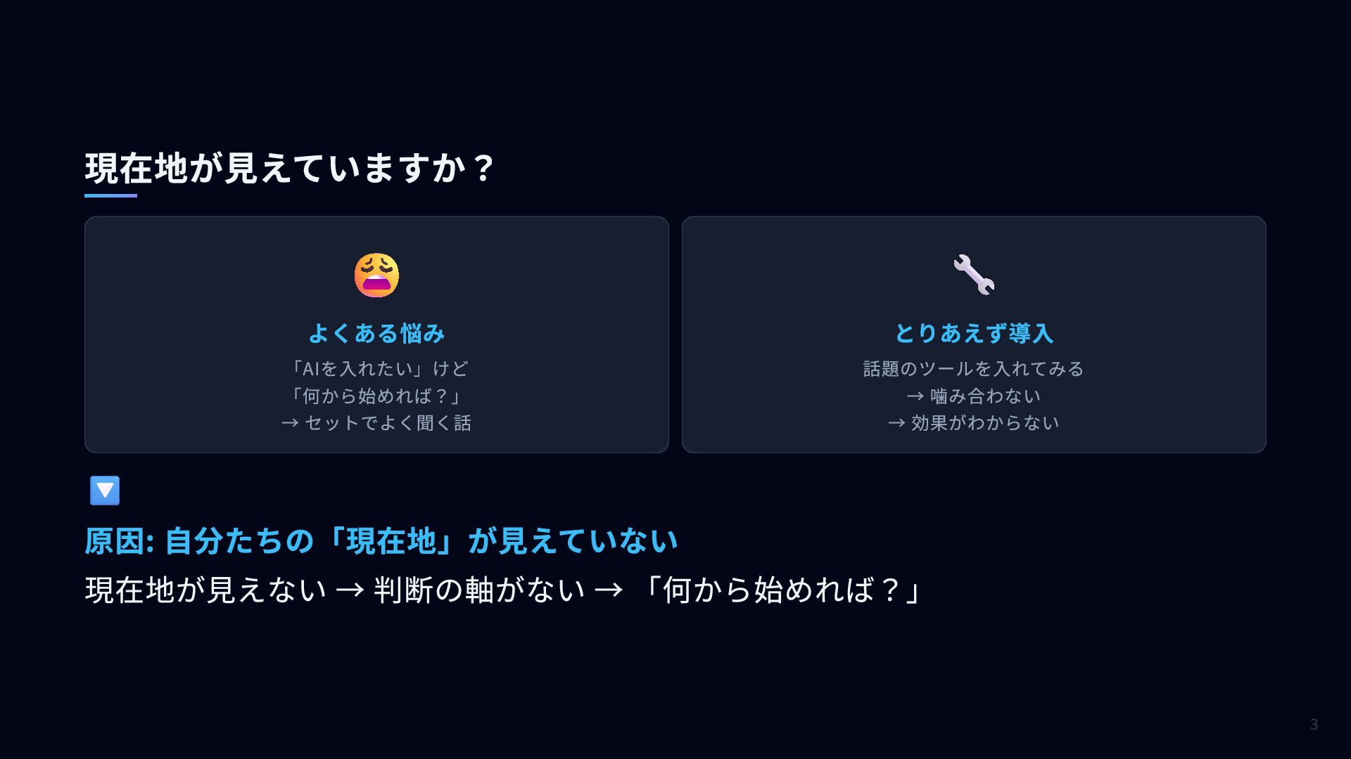 噛み合わない → 効果がわからない 🔽 原因: 自分たちの「現在地」が見えていない 現在地が見えない → 判断の軸がない → 「何から始めれば?」 現在地が見えていますか? 3