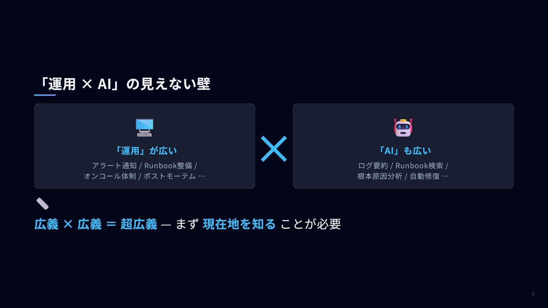 ✕ 🤖 「AI」も広い ログ要約 / Runbook検索 / 根本原因分析 / 自動修復 … 📏 広義 × 広義 = 超広義 — まず 現在地を知る ことが必要 「運用 × AI」の見えない壁 4