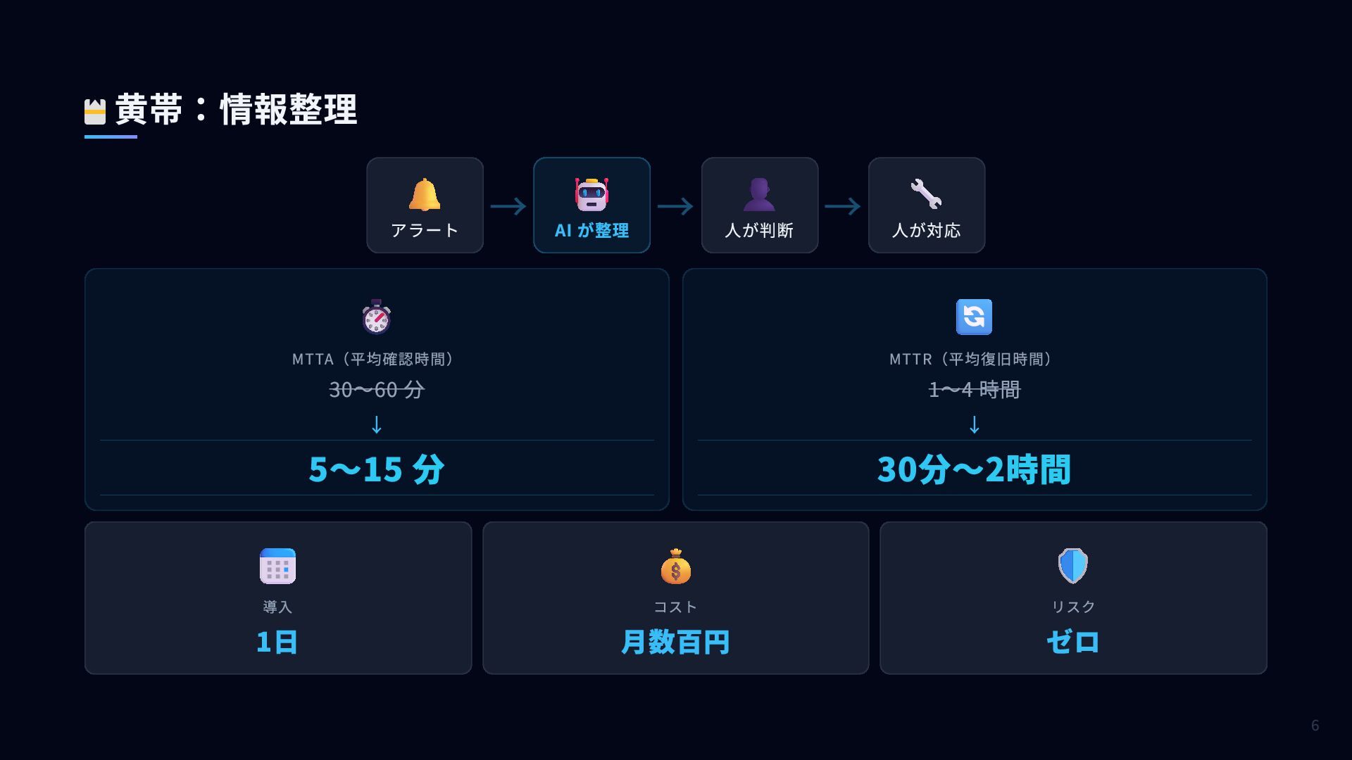 🔧 人が対応 5〜15 分 ⏱️ MTTA(平均確認時間) 30〜60 分 ↓ 30分〜2時間 🔄 MTTR(平均復旧時間) 1〜4 時間 ↓ 📅 導入 1日 💰 コスト 月数百円 🛡️ リスク ゼロ 黄帯:情報整理 6