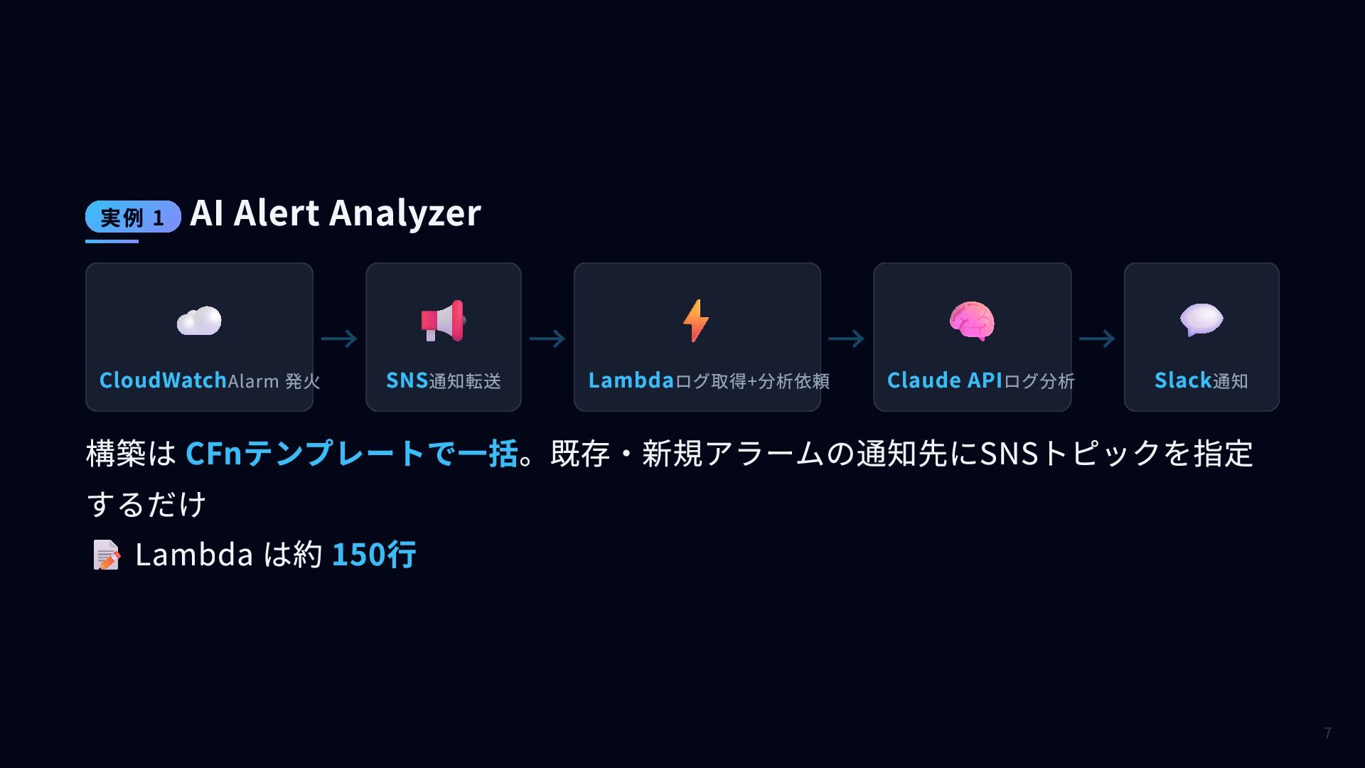🧠 Claude APIログ分析 → 💬 Slack通知 構築は CFnテンプレートで一括。既存・新規アラームの通知先にSNSトピックを指定 するだけ 📝 Lambda は約 150行 実例 1 AI Alert Analyzer 7