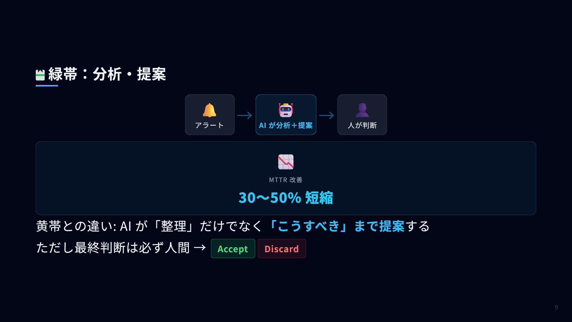 人が判断 📉 MTTR 改善 黄帯との違い: AI が「整理」だけでなく「こうすべき」まで提案する ただし最終判断は必ず人間 → Accept Discard 緑帯:分析・提案 9