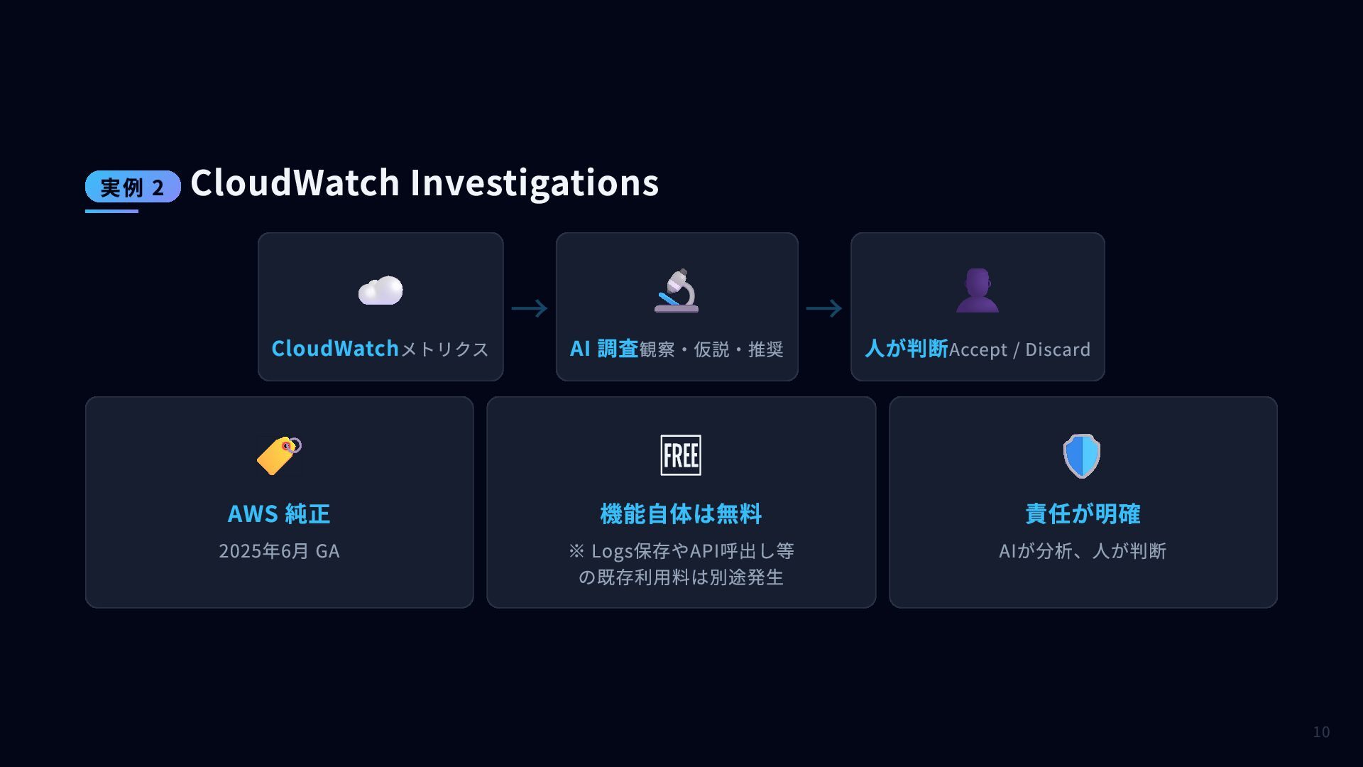 Discard 🏷️ AWS 純正 2025年6月 GA 🆓 機能自体は無料 ※ Logs保存やAPI呼出し等 の既存利用料は別途発生 🛡️ 責任が明確 AIが分析、人が判断 実例 2 CloudWatch Investigations 10