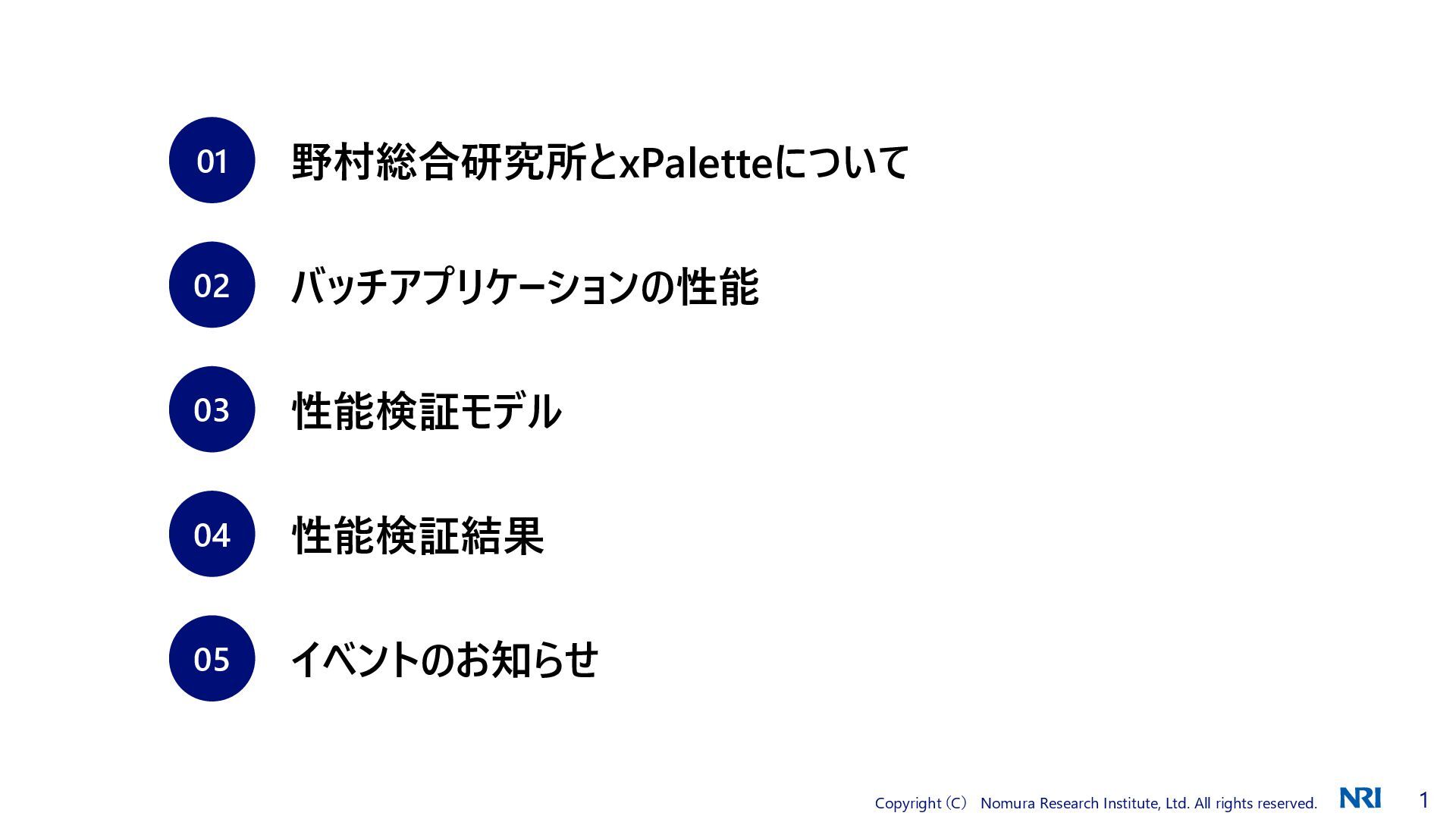 バッチアプリケーションの性能 02 性能検証モデル 03 性能検証結果 04 01 野村総合研究所とxPaletteについて イベントのお知らせ 05