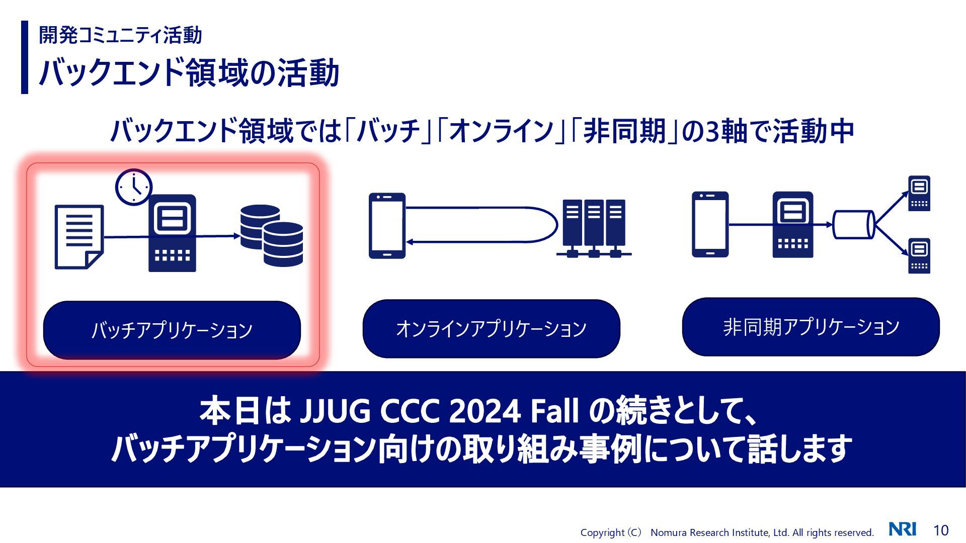 バックエンド領域の活動 開発コミュニティ活動 バッチアプリケーション オンラインアプリケーション 非同期アプリケーション バックエンド領域では「バッチ」「オンライン」「非同期」の3軸で活動中 特定の時刻やイベントで起動し、 特定の処理を実行する アプリケーション クライアントからのリクエストに 応じた処理を実行し、 即時に処理結果を応答する アプリケーション 処理要求に対して、 処理結果を即時に応答せず、 別のサーバーで処理を実行する アプリケーション 本日は JJUG CCC 2024 Fall の続きとして、 バッチアプリケーション向けの取り組み事例について話します
