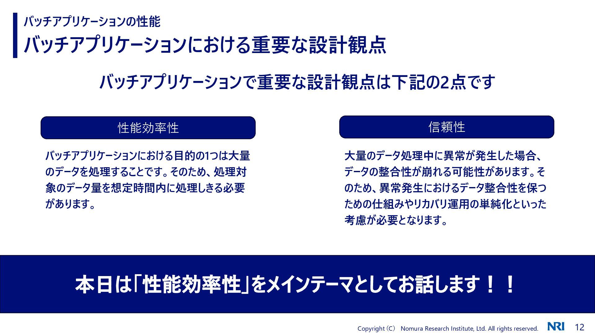 バッチアプリケーションにおける重要な設計観点 バッチアプリケーションの性能 バッチアプリケーションで重要な設計観点は下記の2点です 性能効率性 バッチアプリケーションにおける目的の1つは大量 のデータを処理することです。そのため、処理対 象のデータ量を想定時間内に処理しきる必要 があります。 信頼性 大量のデータ処理中に異常が発生した場合、 データの整合性が崩れる可能性があります。そ のため、異常発生におけるデータ整合性を保つ ための仕組みやリカバリ運用の単純化といった 考慮が必要となります。 本日は「性能効率性」をメインテーマとしてお話します!!