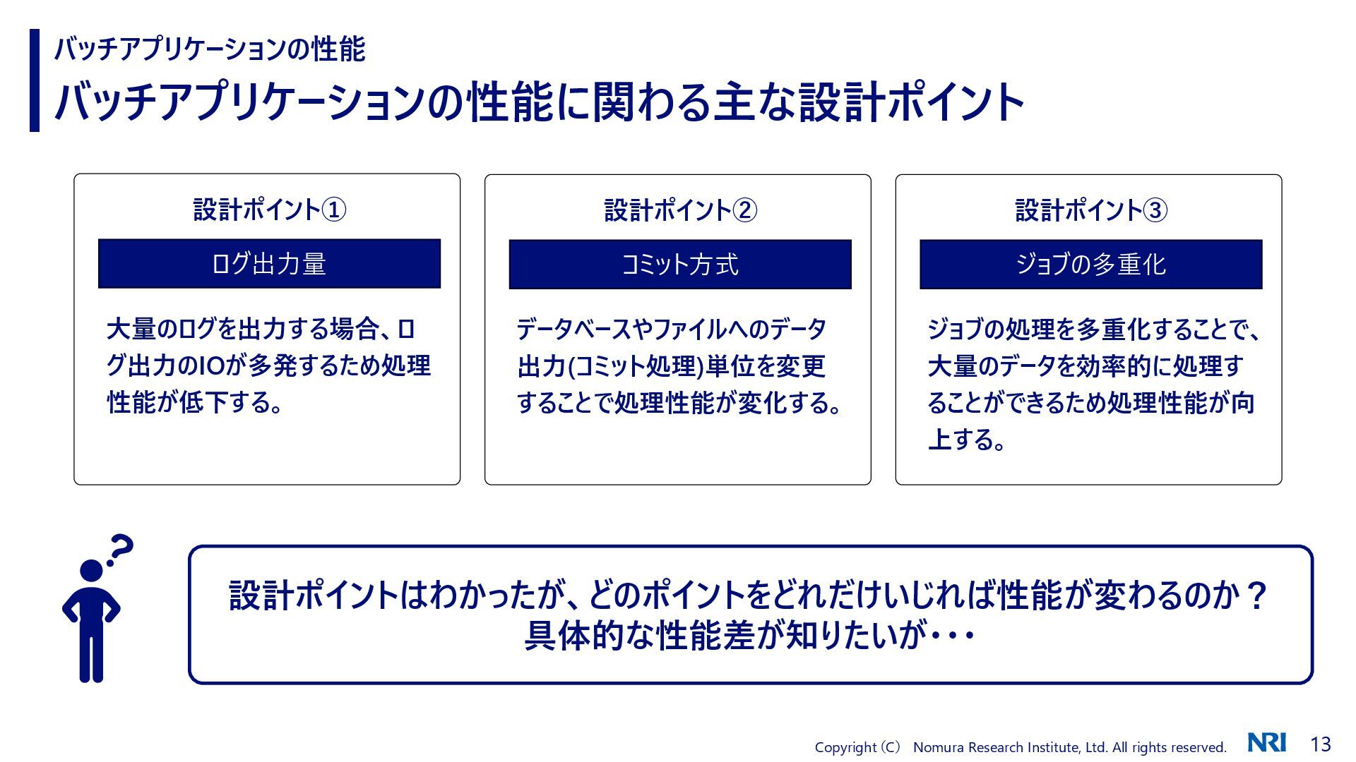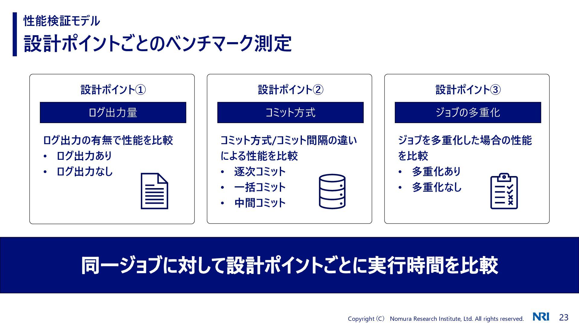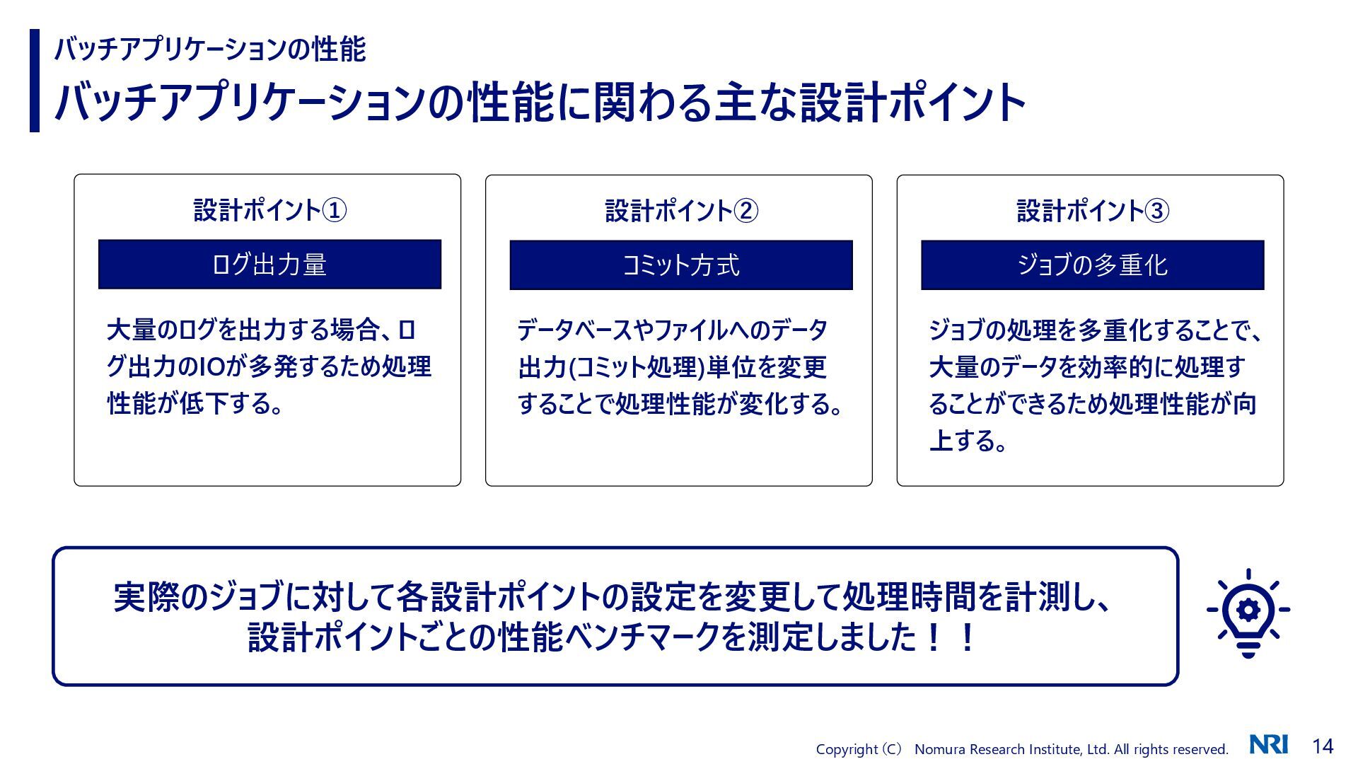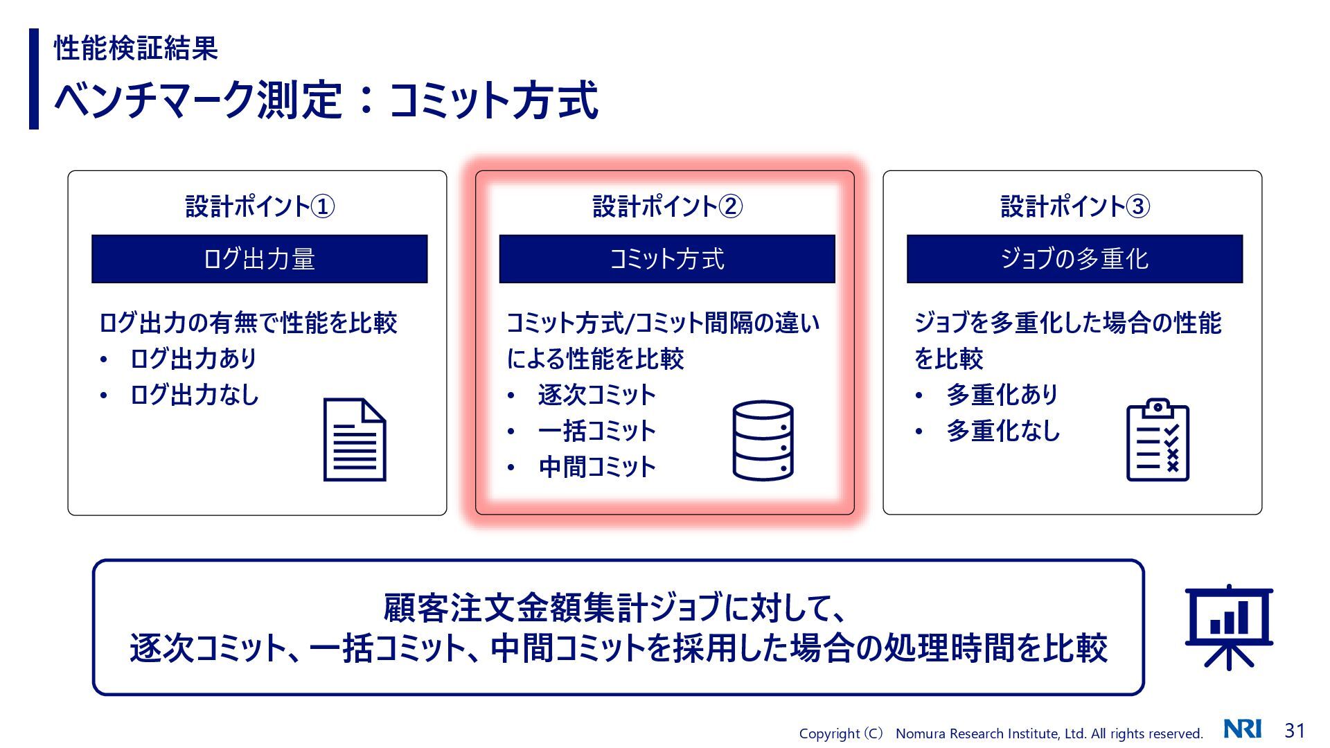 バッチアプリケーションの性能に関わる主な設計ポイント バッチアプリケーションの性能 実際のジョブに対して各設計ポイントの設定を変更して処理時間を計測し、 設計ポイントごとの性能ベンチマークを測定しました!! ログ出力量 大量のログを出力する場合、ロ グ出力のIOが多発するため処理 性能が低下する。 設計ポイント① コミット方式 データベースやファイルへのデータ 出力(コミット処理)単位を変更 することで処理性能が変化する。 設計ポイント② ジョブの多重化 ジョブの処理を多重化することで、 大量のデータを効率的に処理す ることができるため処理性能が向 上する。 設計ポイント③