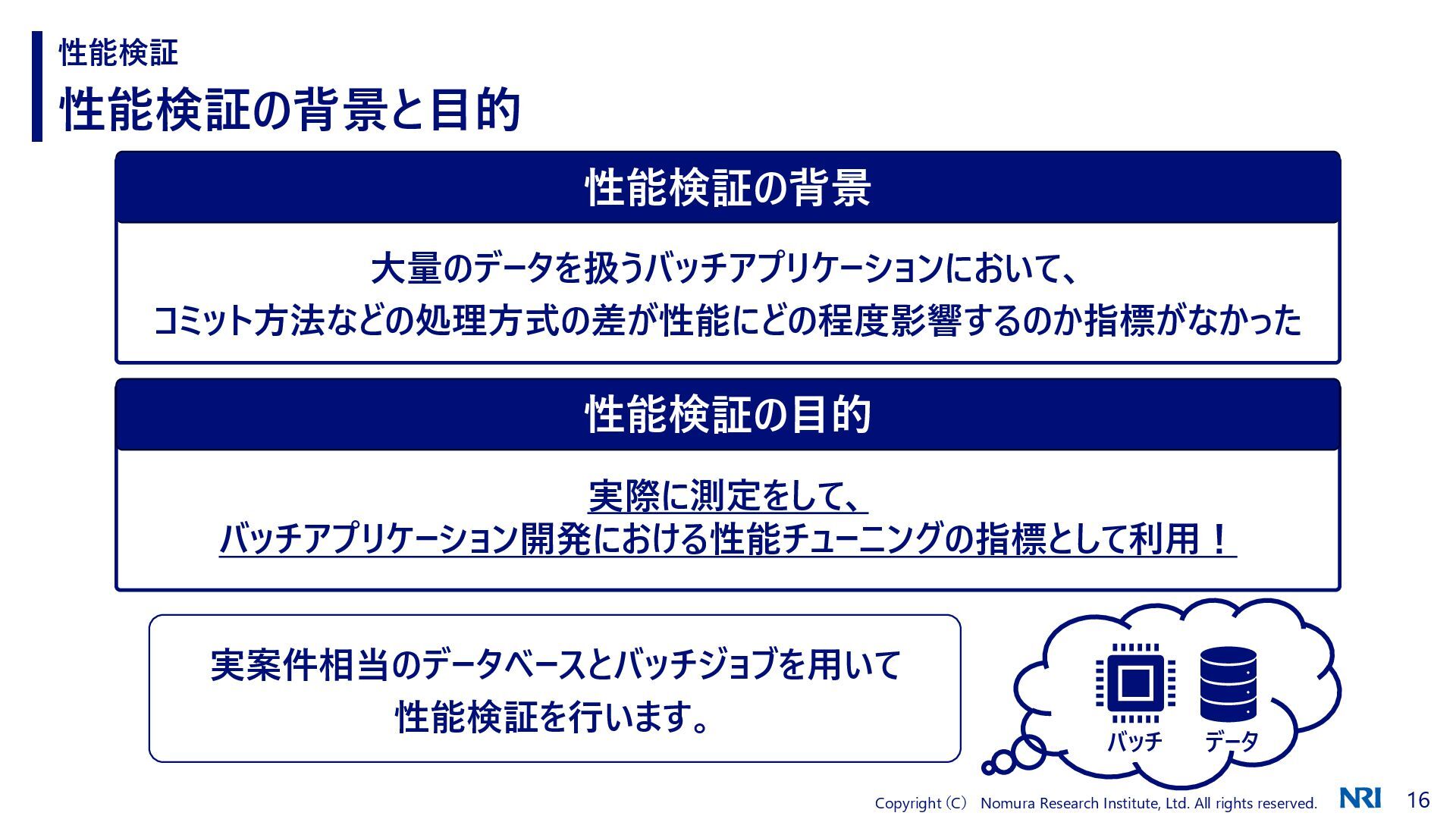 性能検証の背景と目的 性能検証 大量のデータを扱うバッチアプリケーションにおいて、 コミット方法などの処理方式の差が性能にどの程度影響するのか指標がなかった 性能検証の背景 実案件相当のデータベースとバッチジョブを用いて 性能検証を行います。 データ バッチ 実際に測定をして、 バッチアプリケーション開発における性能チューニングの指標として利用! 性能検証の目的