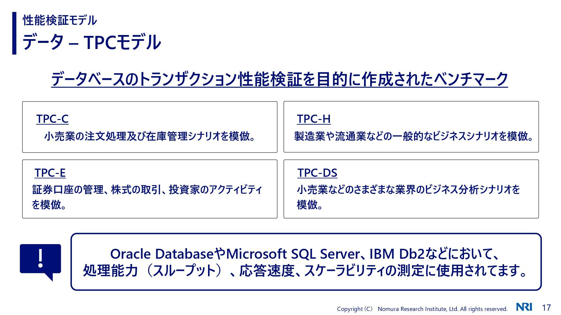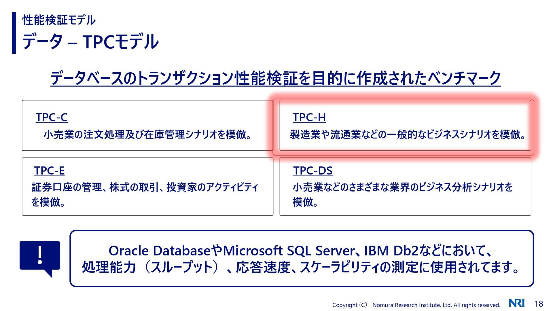 データ – TPCモデル 性能検証モデル データベースのトランザクション性能検証を目的に作成されたベンチマーク TPC-C 小売業の注文処理及び在庫管理シナリオを模倣。 TPC-H 製造業や流通業などの一般的なビジネスシナリオを模倣。 TPC-E 証券口座の管理、株式の取引、投資家のアクティビティ を模倣。 TPC-DS 小売業などのさまざまな業界のビジネス分析シナリオを 模倣。 Oracle DatabaseやMicrosoft SQL Server、IBM Db2などにおいて、 処理能力(スループット)、応答速度、スケーラビリティの測定に使用されてます。