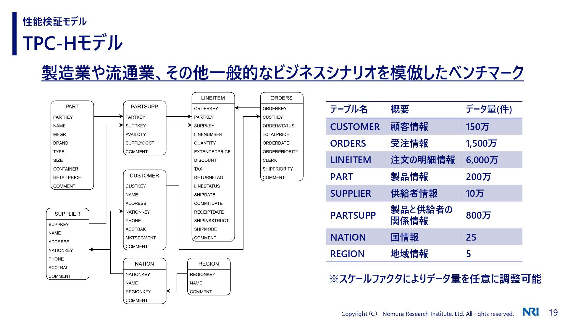 TPC-Hモデル 性能検証モデル ※スケールファクタによりデータ量を任意に調整可能 テーブル名 概要 データ量(件) CUSTOMER 顧客情報 150万 ORDERS 受注情報 1,500万 LINEITEM 注文の明細情報 6,000万 PART 製品情報 200万 SUPPLIER 供給者情報 10万 PARTSUPP 製品と供給者の 関係情報 800万 NATION 国情報 25 REGION 地域情報 5 製造業や流通業、その他一般的なビジネスシナリオを模倣したベンチマーク