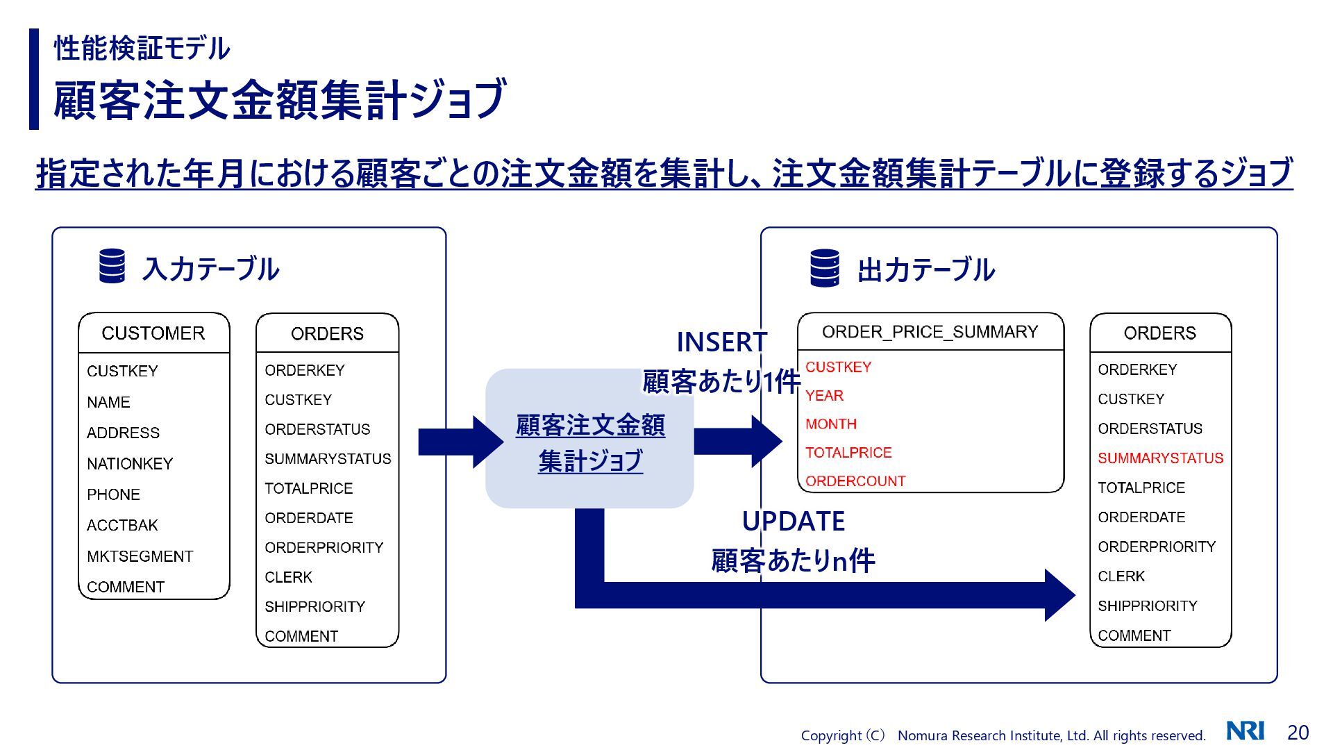 顧客注文金額集計ジョブ 性能検証モデル 指定された年月における顧客ごとの注文金額を集計し、注文金額集計テーブルに登録するジョブ 出力テーブル 入力テーブル UPDATE 顧客あたりn件 顧客注文金額 集計ジョブ INSERT 顧客あたり1件