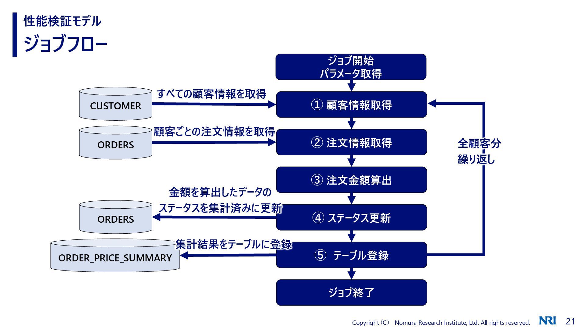 ジョブフロー 性能検証モデル CUSTOMER ① 顧客情報取得 ② 注文情報取得 ジョブ開始 パラメータ取得 ③ 注文金額算出 ④ ステータス更新 ⑤ テーブル登録 ジョブ終了 ORDERS ORDERS ORDER_PRICE_SUMMARY 金額を算出したデータの ステータスを集計済みに更新 集計結果をテーブルに登録 全顧客分 繰り返し すべての顧客情報を取得 顧客ごとの注文情報を取得