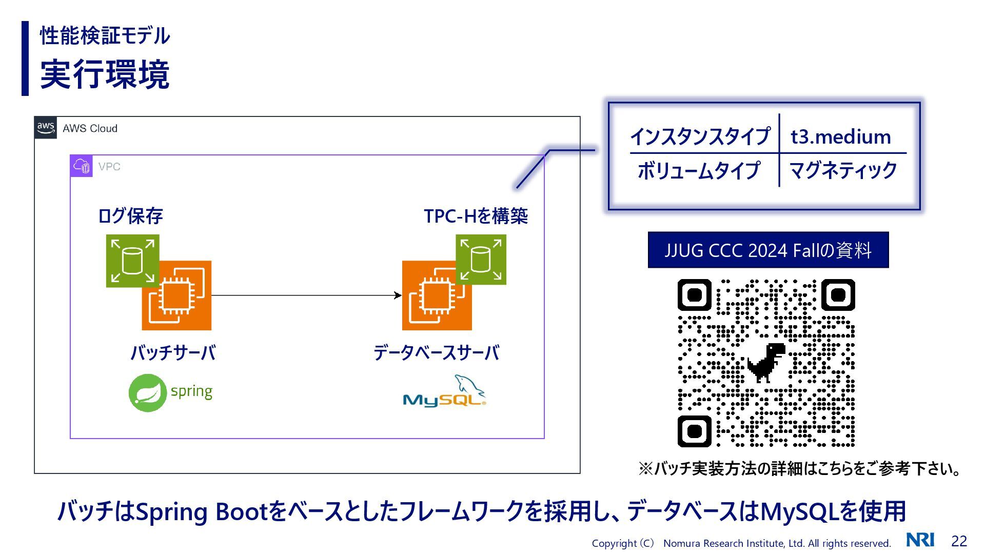 実行環境 性能検証モデル ※バッチ実装方法の詳細はこちらをご参考下さい。 ボリュームタイプ インスタンスタイプ t3.medium マグネティック JJUG CCC 2024 Fallの資料 バッチサーバ データベースサーバ ログ保存 TPC-Hを構築 バッチはSpring Bootをベースとしたフレームワークを採用し、データベースはMySQLを使用
