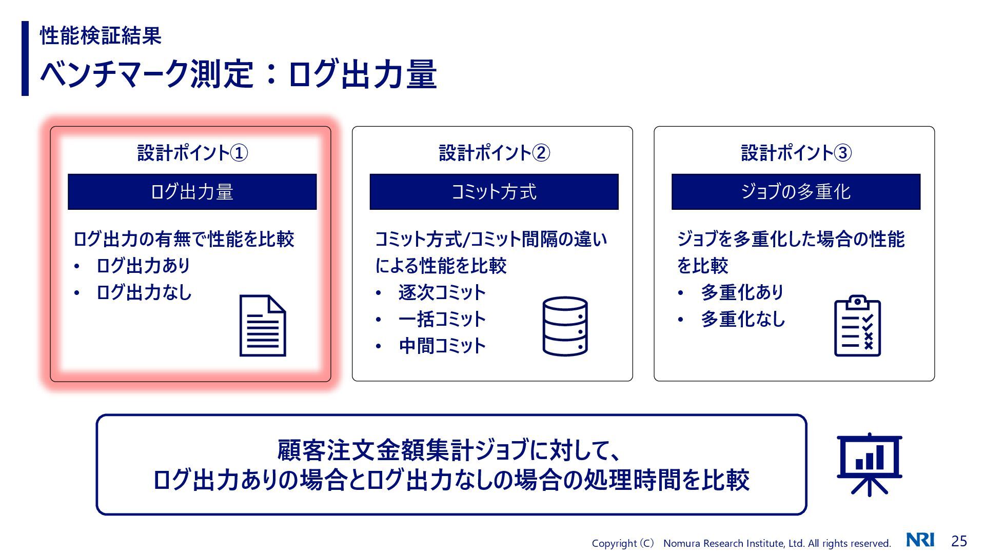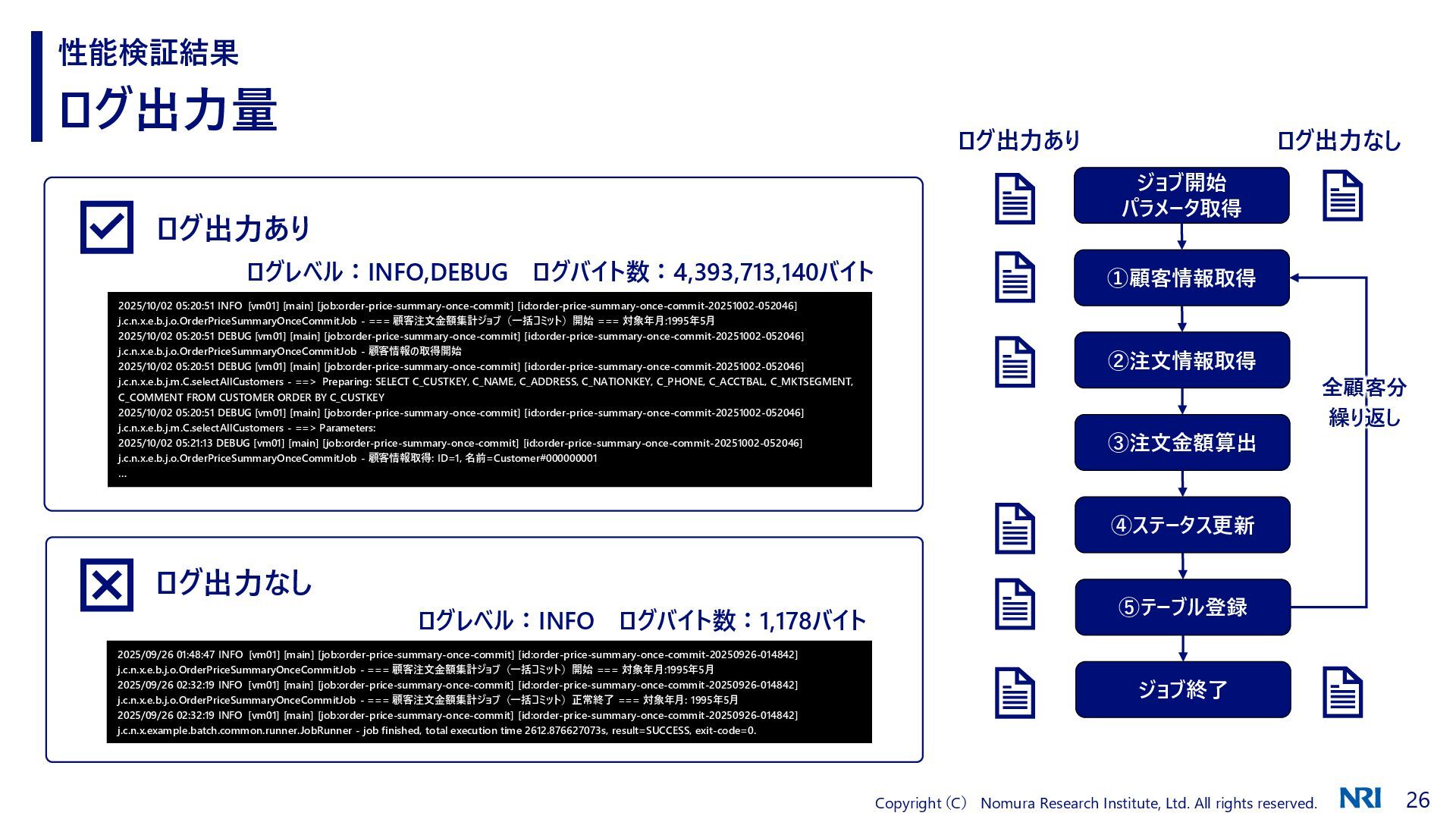 ログ出力量 性能検証結果 ログ出力あり ログ出力なし ログレベル:INFO ログバイト数:1,178バイト ログレベル:INFO,DEBUG ログバイト数:4,393,713,140バイト ①顧客情報取得 ②注文情報取得 ジョブ開始 パラメータ取得 ③注文金額算出 ④ステータス更新 ⑤テーブル登録 ジョブ終了 ログ出力あり ログ出力なし 全顧客分 繰り返し 2025/09/26 01:48:47 INFO [vm01] [main] [job:order-price-summary-once-commit] [id:order-price-summary-once-commit-20250926-014842] j.c.n.x.e.b.j.o.OrderPriceSummaryOnceCommitJob - === 顧客注文金額集計ジョブ(一括コミット)開始 === 対象年月:1995年5月 2025/09/26 02:32:19 INFO [vm01] [main] [job:order-price-summary-once-commit] [id:order-price-summary-once-commit-20250926-014842] j.c.n.x.e.b.j.o.OrderPriceSummaryOnceCommitJob - === 顧客注文金額集計ジョブ(一括コミット)正常終了 === 対象年月: 1995年5月 2025/09/26 02:32:19 INFO [vm01] [main] [job:order-price-summary-once-commit] [id:order-price-summary-once-commit-20250926-014842] j.c.n.x.example.batch.common.runner.JobRunner - job finished, total execution time 2612.876627073s, result=SUCCESS, exit-code=0. 2025/10/02 05:20:51 INFO [vm01] [main] [job:order-price-summary-once-commit] [id:order-price-summary-once-commit-20251002-052046] j.c.n.x.e.b.j.o.OrderPriceSummaryOnceCommitJob - === 顧客注文金額集計ジョブ(一括コミット)開始 === 対象年月:1995年5月 2025/10/02 05:20:51 DEBUG [vm01] [main] [job:order-price-summary-once-commit] [id:order-price-summary-once-commit-20251002-052046] j.c.n.x.e.b.j.o.OrderPriceSummaryOnceCommitJob - 顧客情報の取得開始 2025/10/02 05:20:51 DEBUG [vm01] [main] [job:order-price-summary-once-commit] [id:order-price-summary-once-commit-20251002-052046] j.c.n.x.e.b.j.m.C.selectAllCustomers - ==> Preparing: SELECT C_CUSTKEY, C_NAME, C_ADDRESS, C_NATIONKEY, C_PHONE, C_ACCTBAL, C_MKTSEGMENT, C_COMMENT FROM CUSTOMER ORDER BY C_CUSTKEY 2025/10/02 05:20:51 DEBUG [vm01] [main] [job:order-price-summary-once-commit] [id:order-price-summary-once-commit-20251002-052046] j.c.n.x.e.b.j.m.C.selectAllCustomers - ==> Parameters: 2025/10/02 05:21:13 DEBUG [vm01] [main] [job:order-price-summary-once-commit] [id:order-price-summary-once-commit-20251002-052046] j.c.n.x.e.b.j.o.OrderPriceSummaryOnceCommitJob - 顧客情報取得: ID=1, 名前=Customer#000000001 …