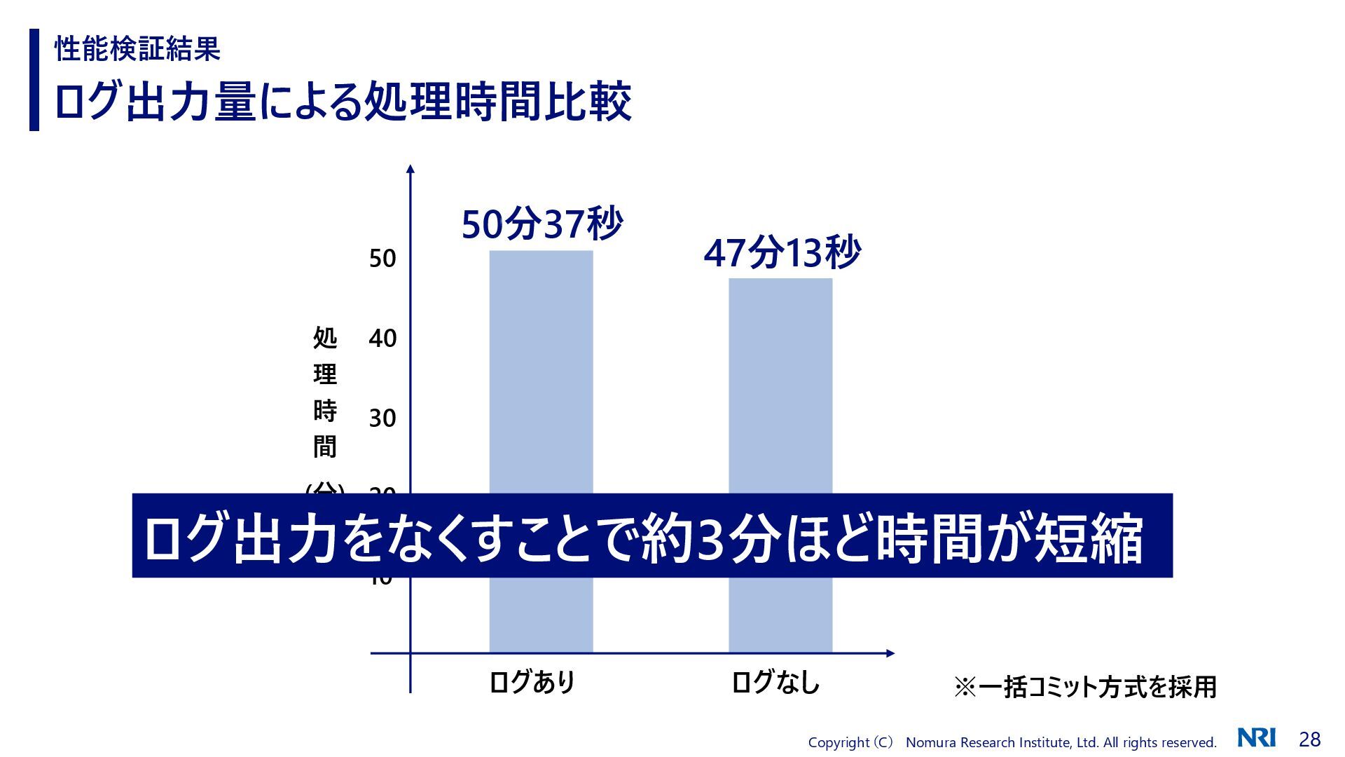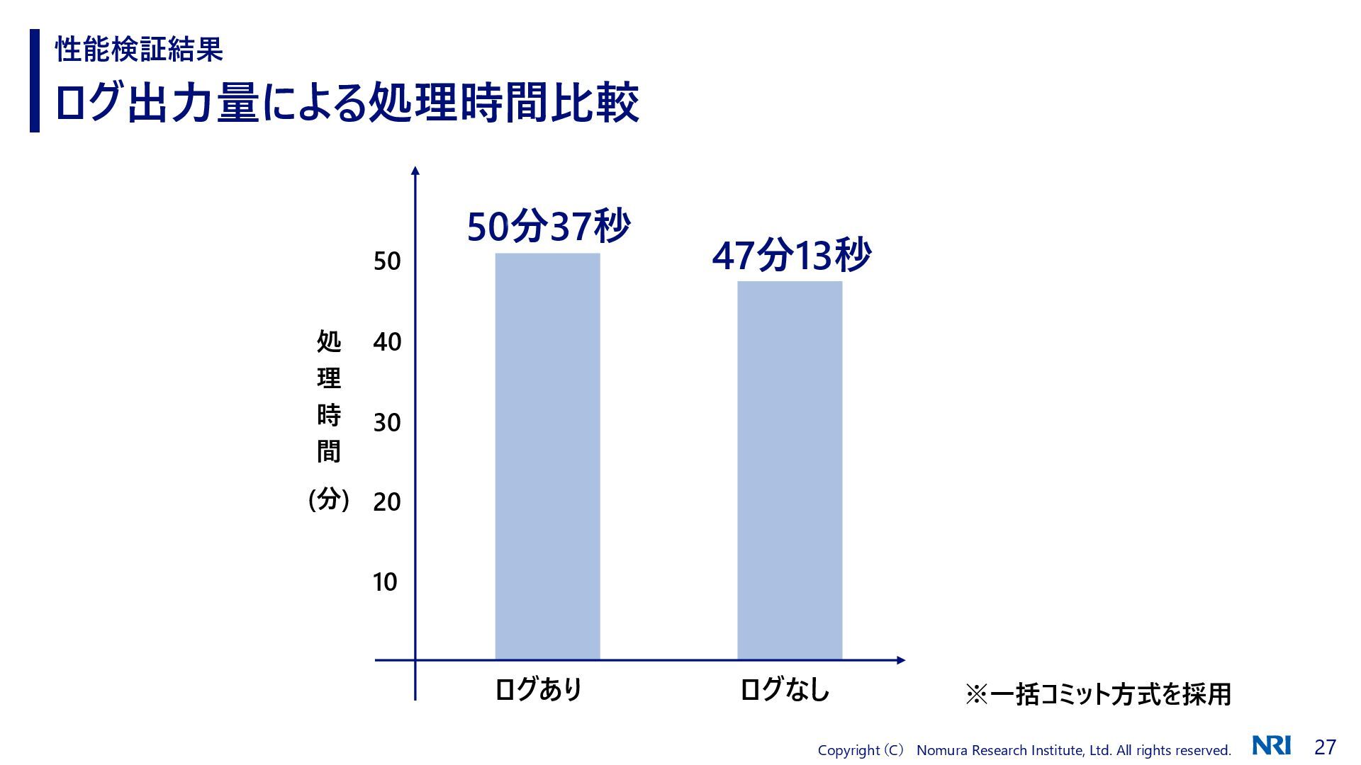 ログ出力量による処理時間比較 性能検証結果 10 20 30 40 50 処 理 時 間 (分) ログあり ログなし 50分37秒 47分13秒 ※一括コミット方式を採用
