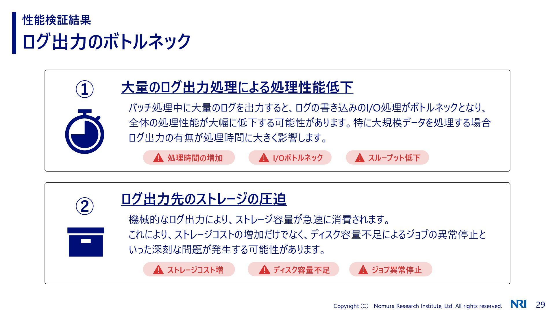 ログ出力のボトルネック 性能検証結果 大量のログ出力処理による処理性能低下 ① バッチ処理中に大量のログを出力すると、ログの書き込みのI/O処理がボトルネックとなり、 全体の処理性能が大幅に低下する可能性があります。特に大規模データを処理する場合 ログ出力の有無が処理時間に大きく影響します。 ログ出力先のストレージの圧迫 ② 機械的なログ出力により、ストレージ容量が急速に消費されます。 これにより、ストレージコストの増加だけでなく、ディスク容量不足によるジョブの異常停止と いった深刻な問題が発生する可能性があります。 処理時間の増加 I/Oボトルネック スループット低下 ストレージコスト増 ディスク容量不足 ジョブ異常停止
