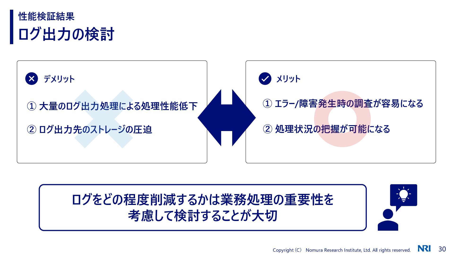 ログ出力の検討 性能検証結果 ① 大量のログ出力処理による処理性能低下 ② ログ出力先のストレージの圧迫 デメリット メリット ① エラー/障害発生時の調査が容易になる ② 処理状況の把握が可能になる ログをどの程度削減するかは業務処理の重要性を 考慮して検討することが大切