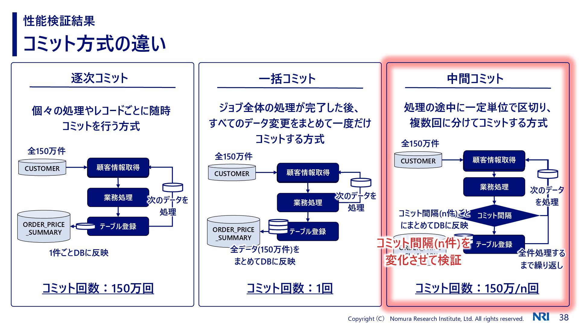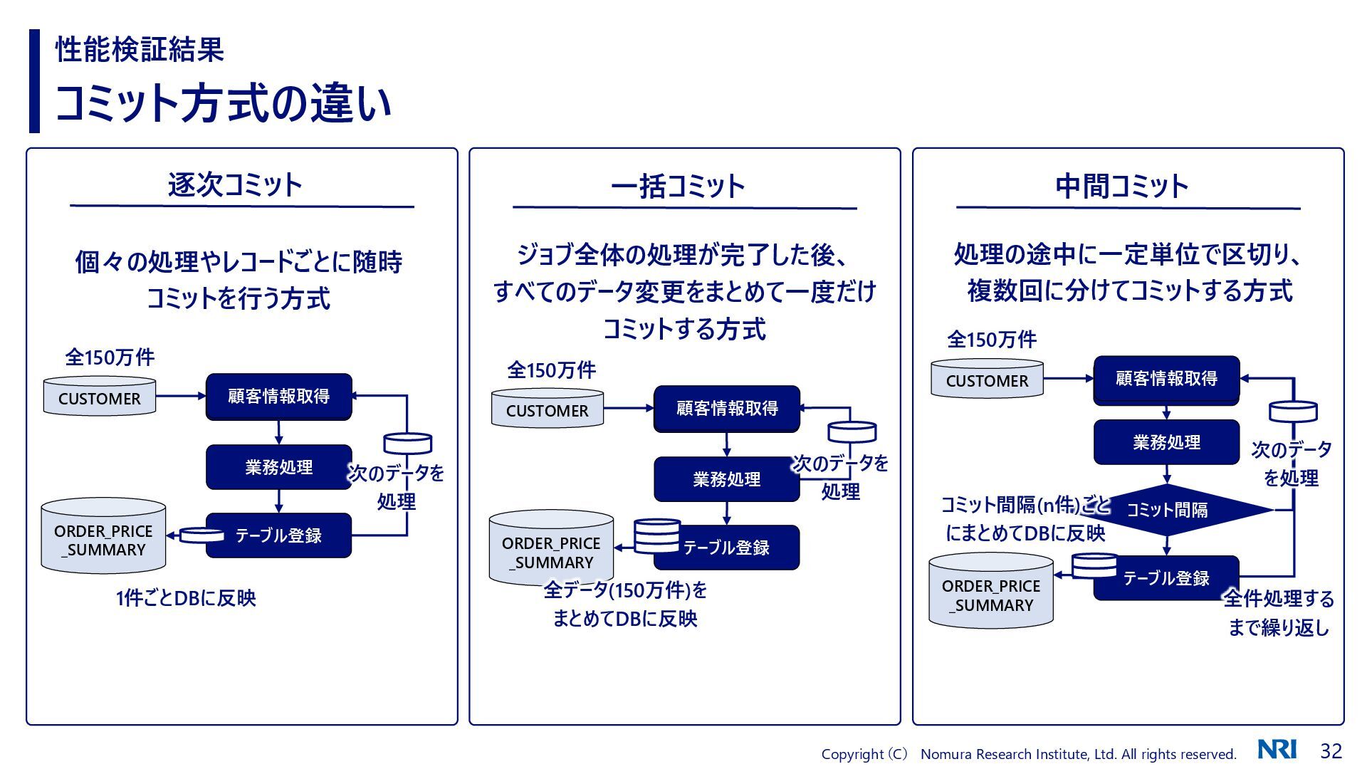 コミット方式の違い 性能検証結果 一括コミット 顧客情報取得 テーブル登録 CUSTOMER 顧客情報取得 ORDER_PRICE _SUMMARY 全データ(150万件)を まとめてDBに反映 業務処理 全150万件 次のデータを 処理 ジョブ全体の処理が完了した後、 すべてのデータ変更をまとめて一度だけ コミットする方式 顧客情報取得 テーブル登録 CUSTOMER 顧客情報取得 ORDER_PRICE _SUMMARY 業務処理 全150万件 次のデータ を処理 処理の途中に一定単位で区切り、 複数回に分けてコミットする方式 コミット間隔 コミット間隔(n件)ごと にまとめてDBに反映 全件処理する まで繰り返し 中間コミット 顧客情報取得 テーブル登録 CUSTOMER 顧客情報取得 ORDER_PRICE _SUMMARY 業務処理 全150万件 次のデータを 処理 1件ごとDBに反映 個々の処理やレコードごとに随時 コミットを行う方式 逐次コミット コミット回数:150万回 コミット回数:1回 コミット回数:150万件/n回