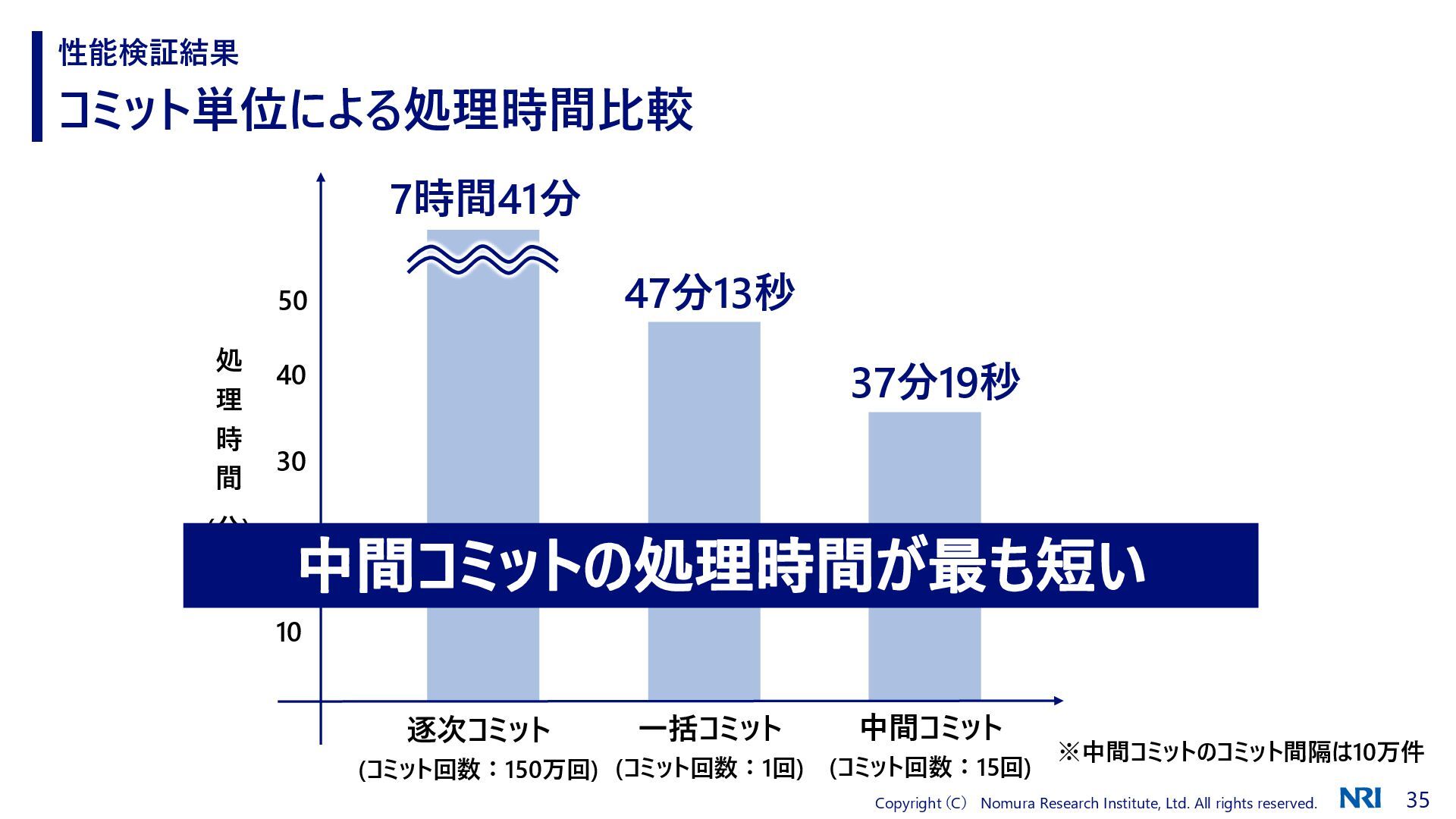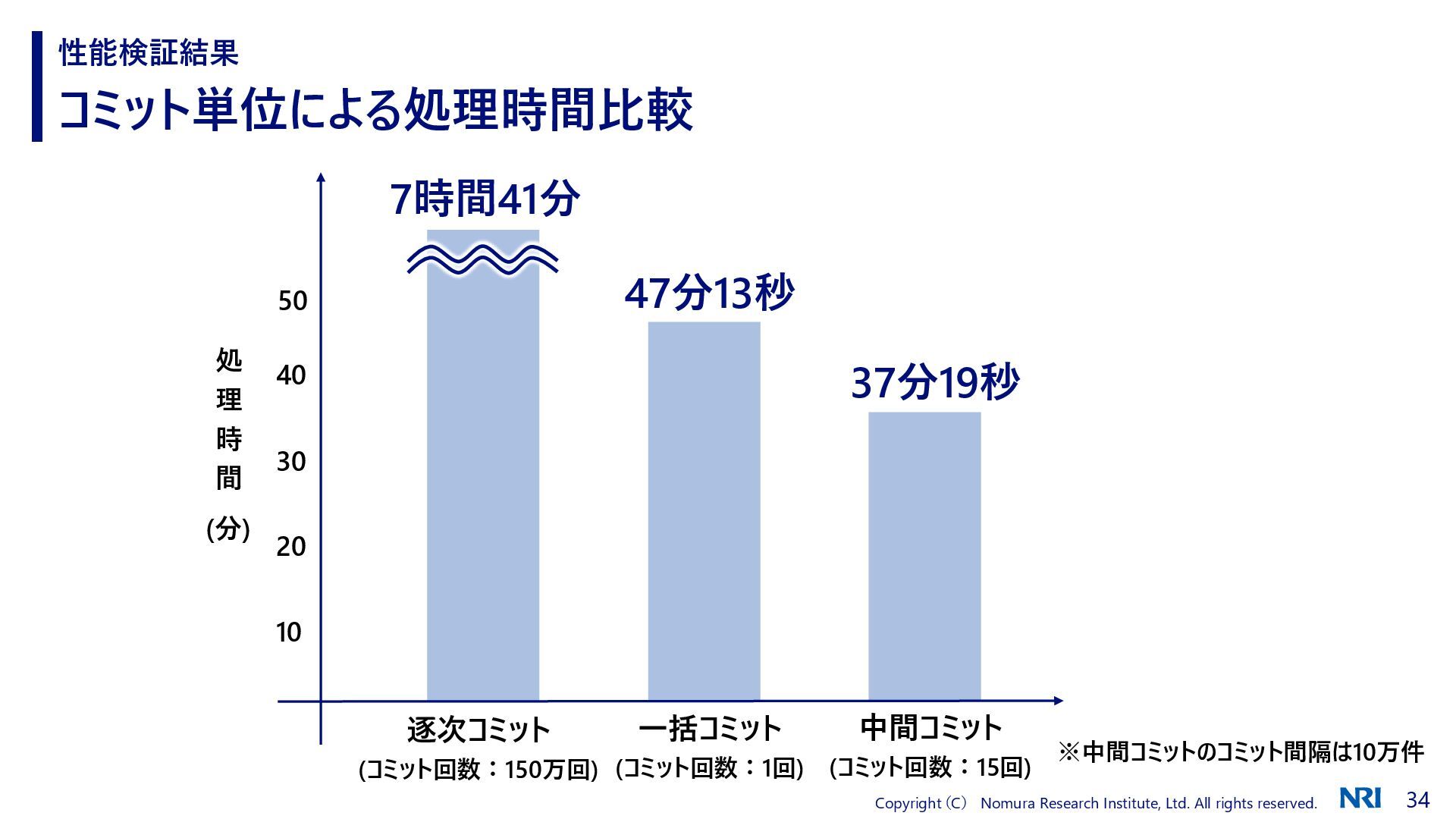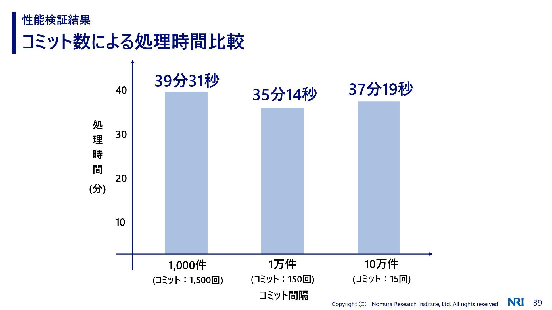 コミット数による処理時間比較 性能検証結果 10 20 30 40 処 理 時 間 (分) 39分31秒 35分14秒 37分19秒 1,000件 (コミット:1,500回) 10万件 (コミット:15回) 1万件 (コミット:150回) コミット間隔