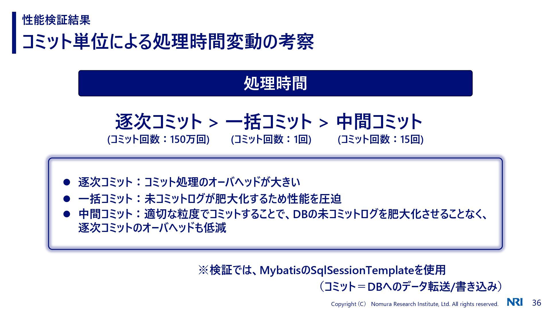 逐次コミット > 一括コミット > 中間コミット 処理時間 ※検証では、MybatisのSqlSessionTemplateを使用 (コミット=DBへのデータ転送/書き込み) ⚫ 逐次コミット:コミット処理のオーバヘッドが大きい ⚫ 一括コミット:未コミットログが肥大化するため性能を圧迫 ⚫ 中間コミット:適切な粒度でコミットすることで、DBの未コミットログを肥大化させることなく、 逐次コミットのオーバヘッドも低減 (コミット回数:150万回) (コミット回数:1回) (コミット回数:15回) コミット単位による処理時間変動の考察 性能検証結果