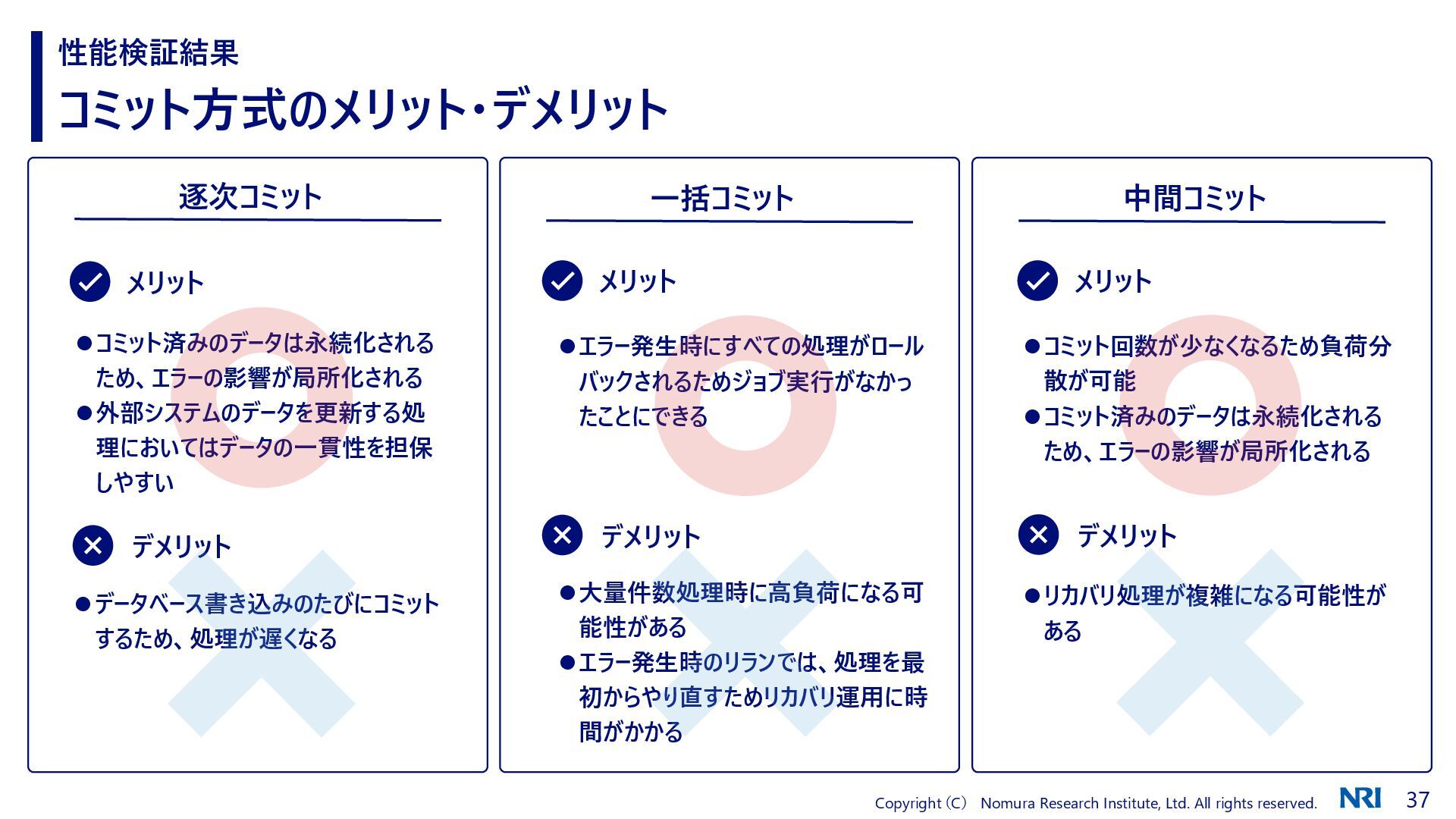 コミット方式のメリット・デメリット 性能検証結果 一括コミット 中間コミット 逐次コミット メリット ⚫コミット済みのデータは永続化される ため、エラーの影響が局所化される ⚫外部システムのデータを更新する処 理においてはデータの一貫性を担保 しやすい デメリット ⚫データベース書き込みのたびにコミット するため、処理が遅くなる メリット ⚫コミット回数が少なくなるため負荷分 散が可能 ⚫コミット済みのデータは永続化される ため、エラーの影響が局所化される デメリット ⚫リカバリ処理が複雑になる可能性が ある メリット デメリット ⚫エラー発生時にすべての処理がロール バックされるためジョブ実行がなかっ たことにできる ⚫大量件数処理時に高負荷になる可 能性がある ⚫エラー発生時のリランでは、処理を最 初からやり直すためリカバリ運用に時 間がかかる