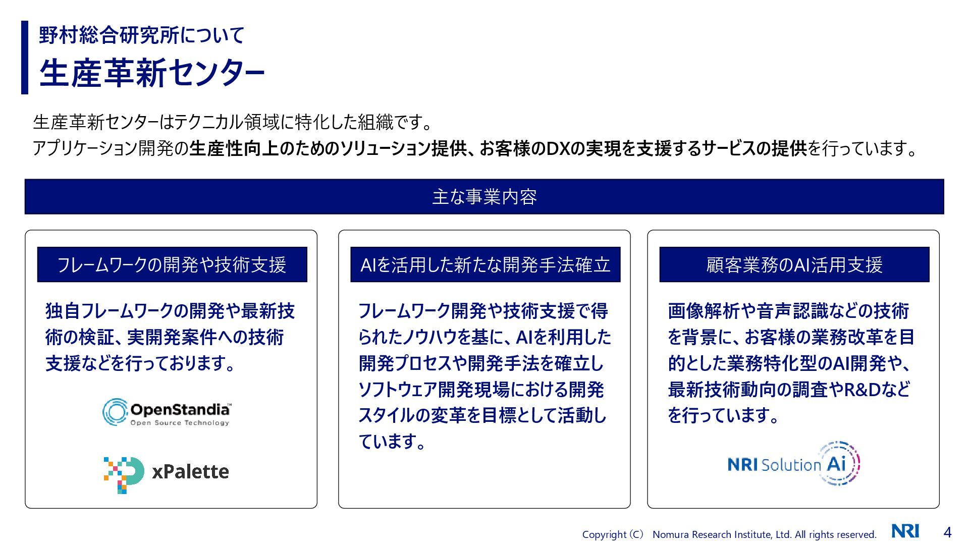 生産革新センター 野村総合研究所について 主な事業内容 生産革新センターはテクニカル領域に特化した組織です。 アプリケーション開発の生産性向上のためのソリューション提供、お客様のDXの実現を支援するサービスの提供を行っています。 フレームワークの開発や技術支援 独自フレームワークの開発や最新技 術の検証、実開発案件への技術 支援などを行っております。 AIを活用した新たな開発手法確立 フレームワーク開発や技術支援で得 られたノウハウを基に、AIを利用した 開発プロセスや開発手法を確立し ソフトウェア開発現場における開発 スタイルの変革を目標として活動し ています。 顧客業務のAI活用支援 画像解析や音声認識などの技術 を背景に、お客様の業務改革を目 的とした業務特化型のAI開発や、 最新技術動向の調査やR&Dなど を行っています。