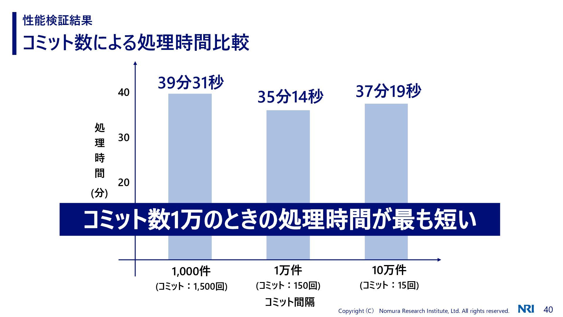 コミット数による処理時間比較 性能検証結果 10 20 30 40 処 理 時 間 (分) 39分31秒 35分14秒 37分19秒 1,000件 (コミット:1,500回) 10万件 (コミット:15回) 1万件 (コミット:150回) コミット間隔 コミット数1万のときの処理時間が最も短い